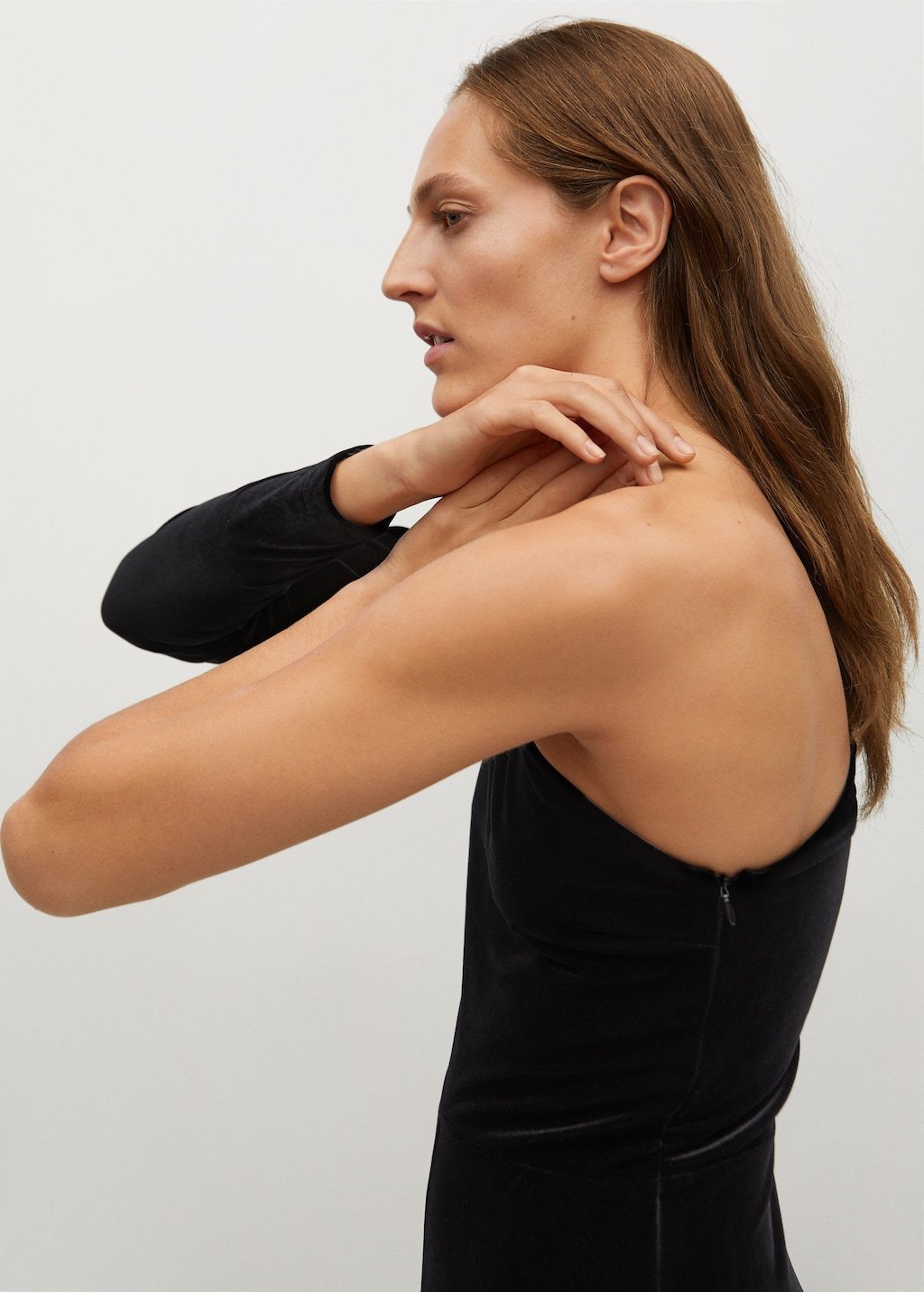 Velvet fabric. Asymmetric design. Long design. Straight neck. Long sleeve. Inner lining.