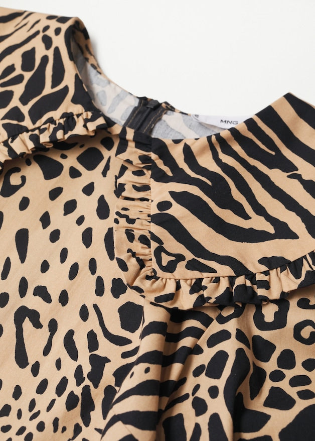 100% Cotton. Printed design. Animal print. Straight design. Short design. Baby doll neck. Three quarter sleeve with elastic cuffs. Zip fastening on the back section.