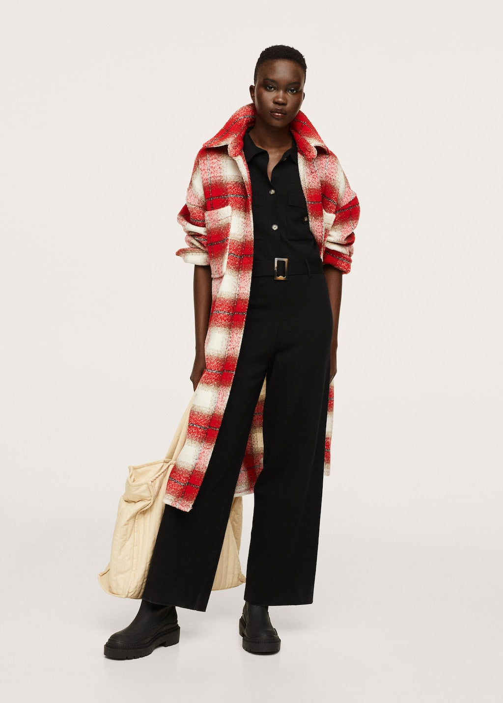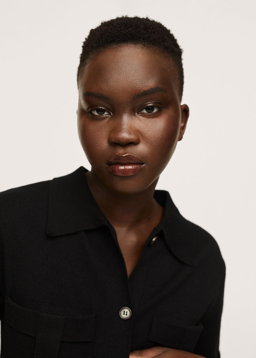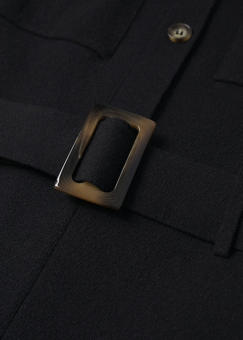 Fine knit fabric. Light fabric. Straight design. Long design. Shirt-style collar. Short sleeve. Two-buttoned flap chest pockets. Button fastening on the front section. Loops. Adjustable belt.