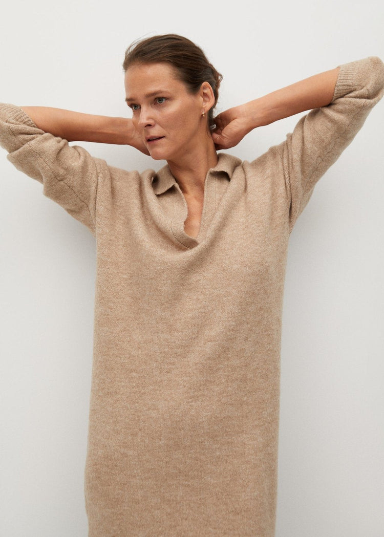 Knitted fabric. Shirt-style. Midi design. Lapel-collar V-neck collar. Dropped shoulder seams. Long sleeve. Side slits. Straight design.