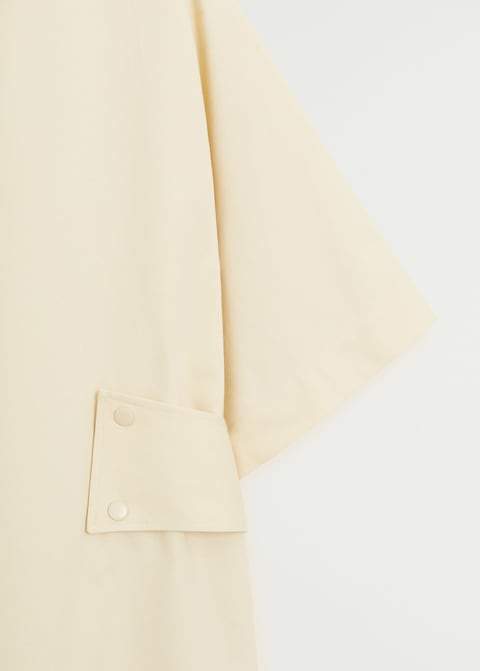 100% Cotton. Short design. Flared design. Shirt-style. Lapel-collar V-neck collar. Short sleeve. Adjustable belt. Button fastening on the front section.