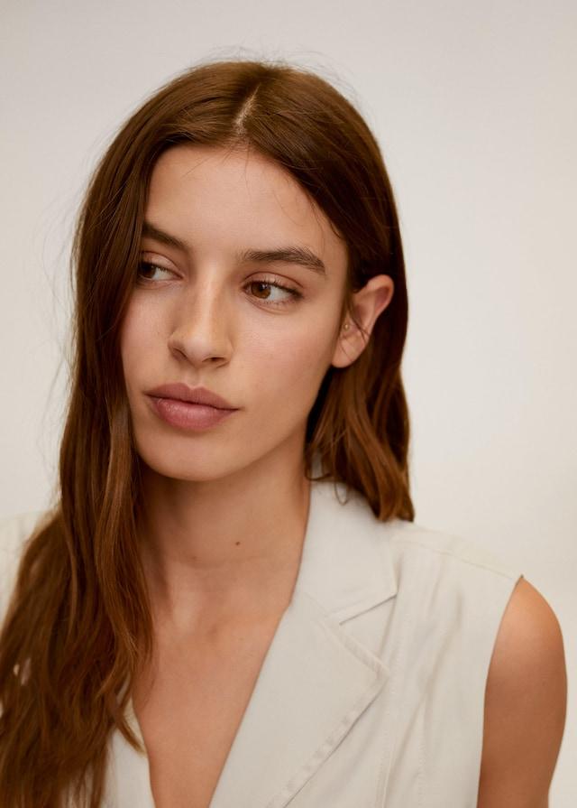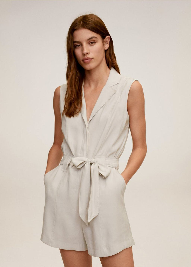 Straight fit. Lapel-collar. Sleeveless. Elastic waist. Adjustable bows fastening.