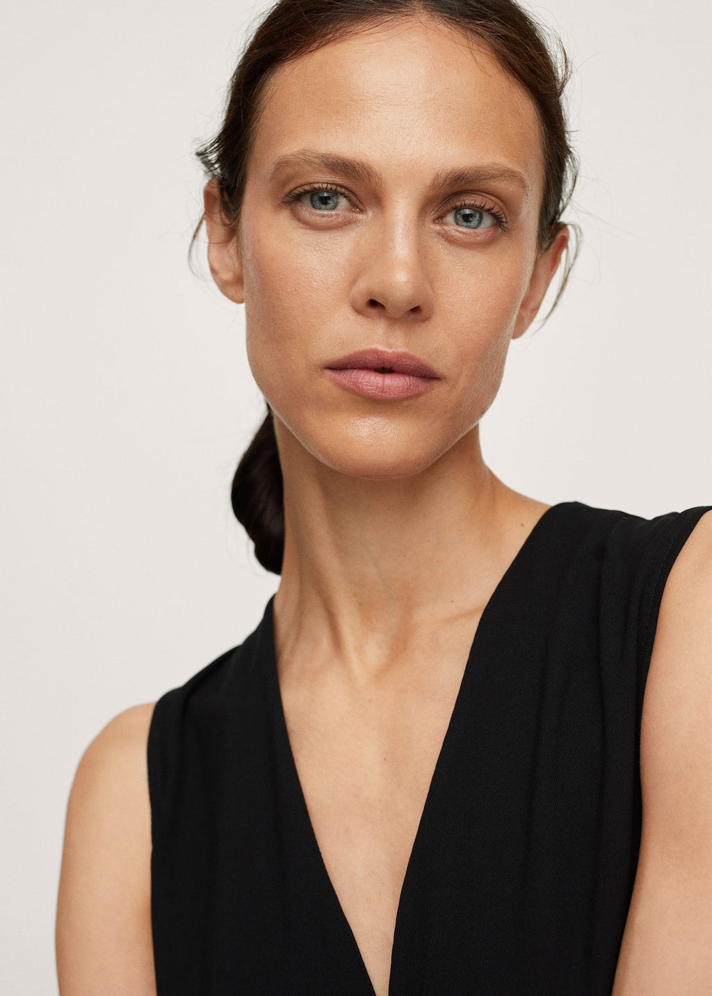 Flowy fabric. Long design. Wide-leg design. V-neck. Sleeveless. Wide straps. Knot on the waist. Invisible back zip fastening.