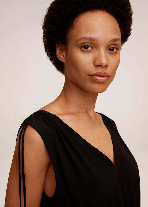 Flowy fabric. Flared design. V-neck. Wide straps. Side bow fastenings. Fitted waist.