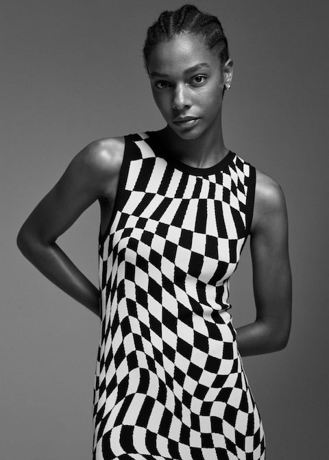 Knitted fabric. Check-pattern. Tailored design. Long design. Rounded neck. Sleeveless. Geometric design.
