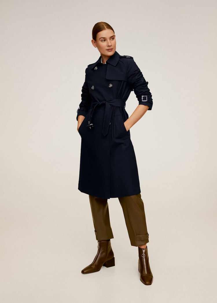 Long design, fabric with cotton, lapel-collar, lapel with notch, two side pockets, long sleeve, loops on the cuffs, loops, belt buckle fastening, back slit, double button fastening.