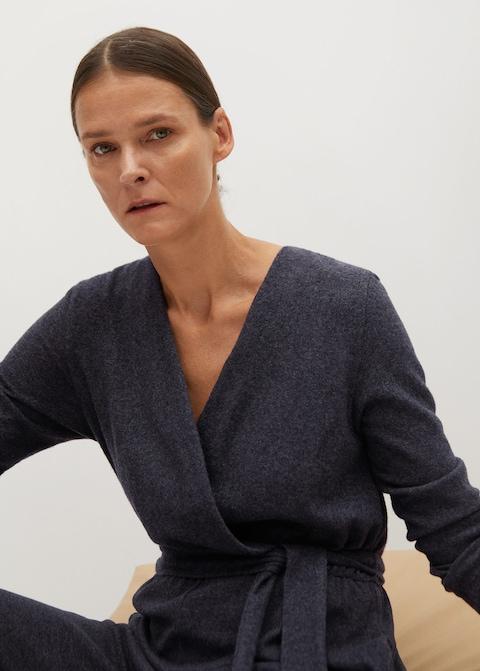 Fabric with cotton. Long design. Crossover design. V-neck. Long sleeve. Elastic waist. Adjustable belt.