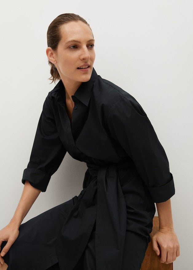 Committed Collection. Fabric with cotton. Flared design. Midi design. Shirt-style collar. Long sleeve with buttoned cuffs. Adjustable belt. Button fastening on the front section.