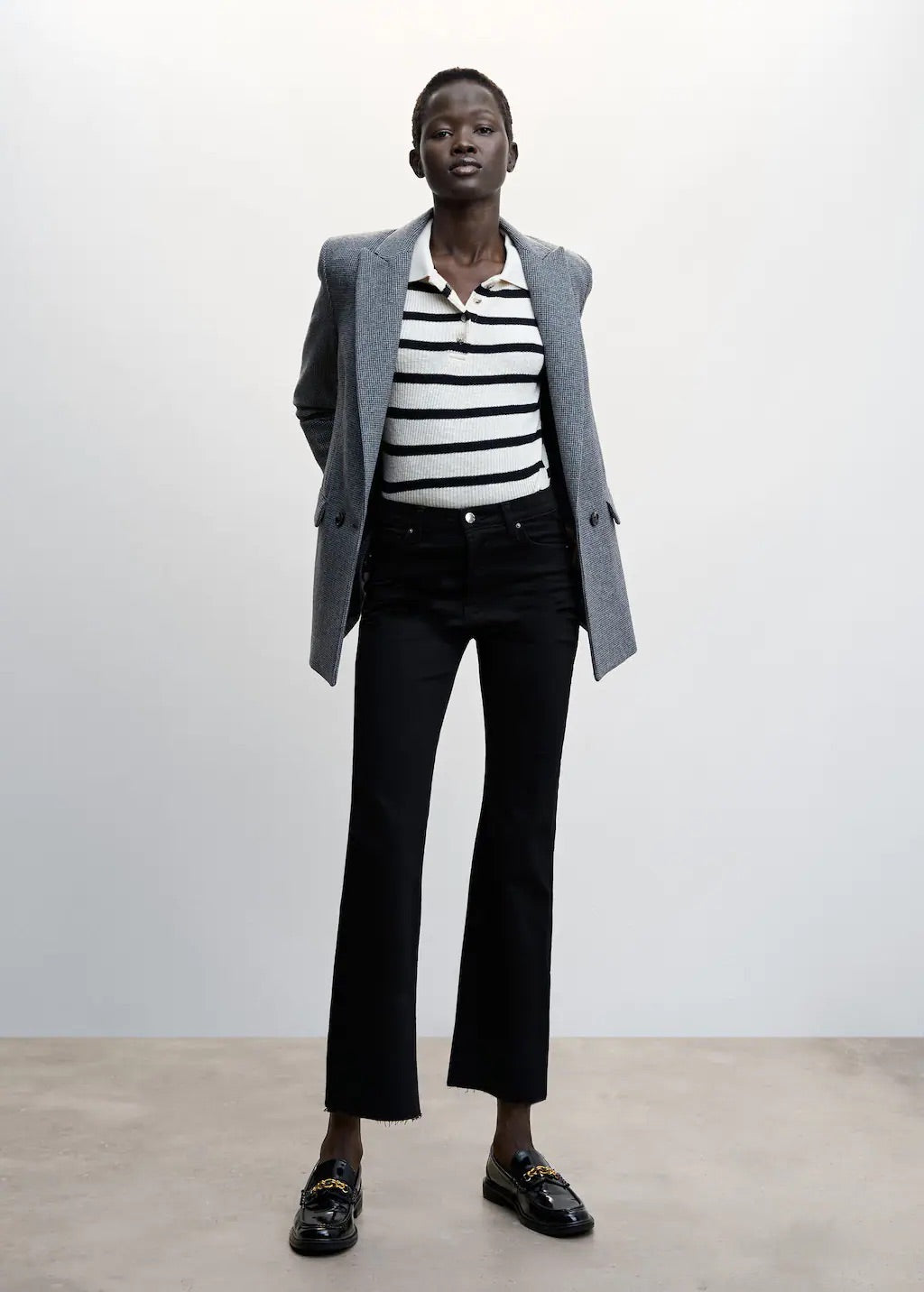 Denim style cotton fabric. Recycled cotton-blend fabric. Elastic. Flared design. Flare design. Cropped design. Frayed hem. High waist. Loops. Five pockets. Zip and one button fastening. Inseam 68 cm.