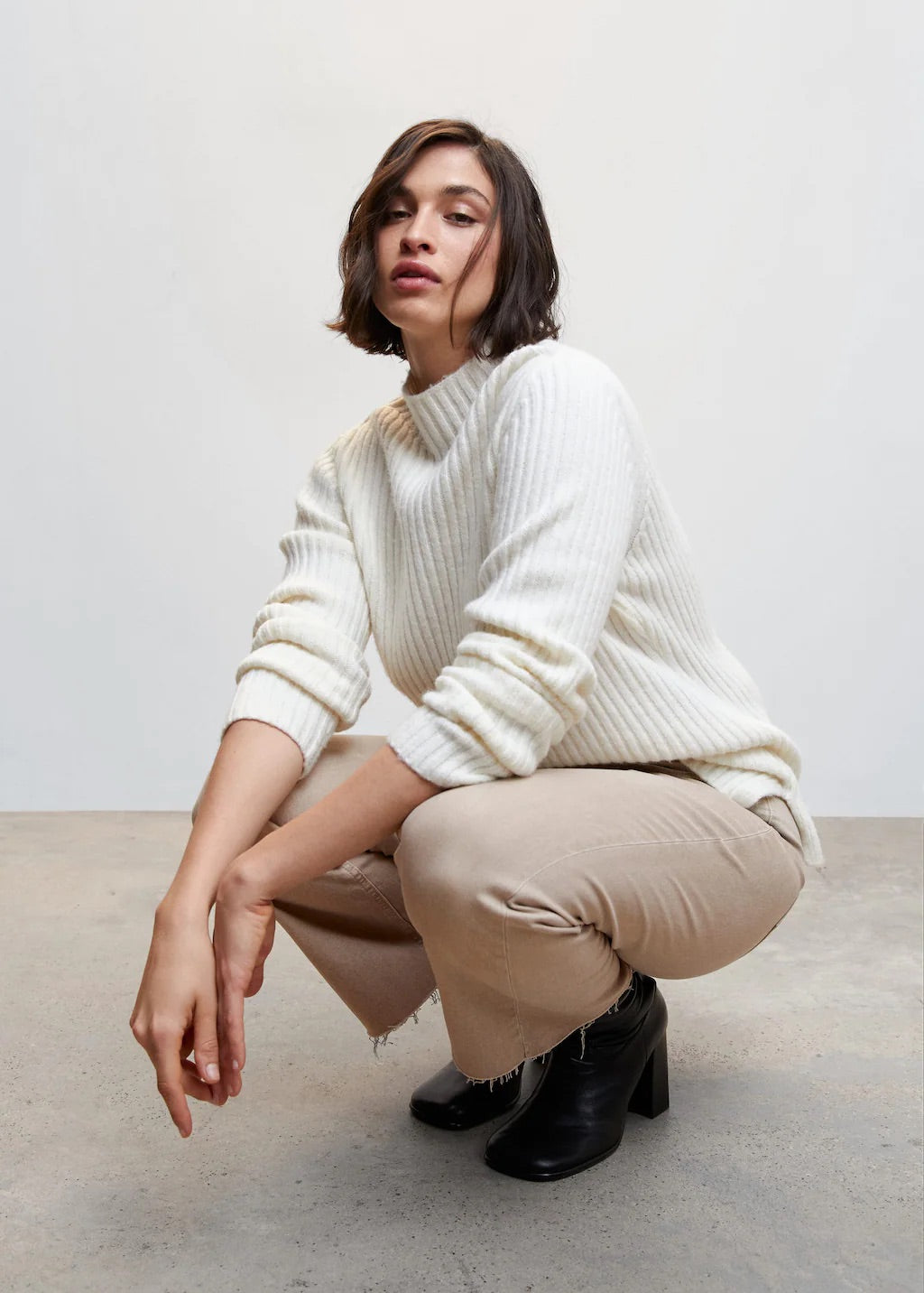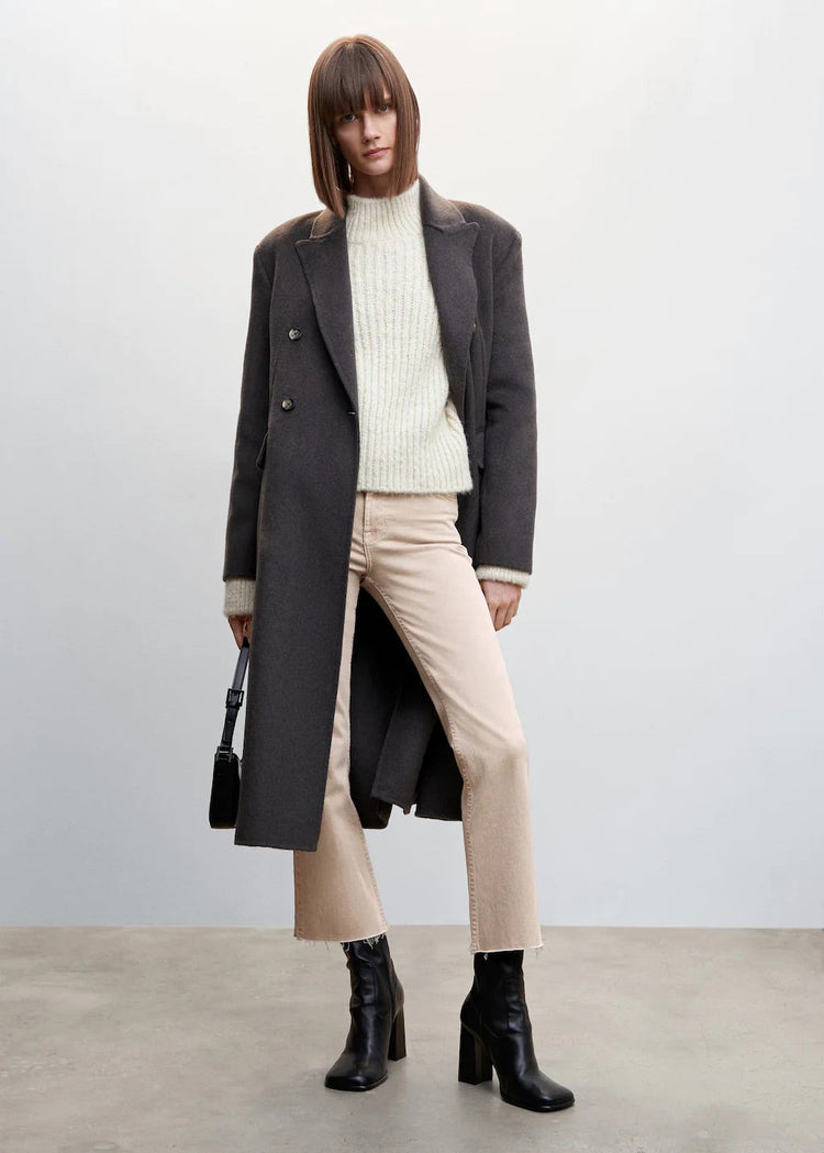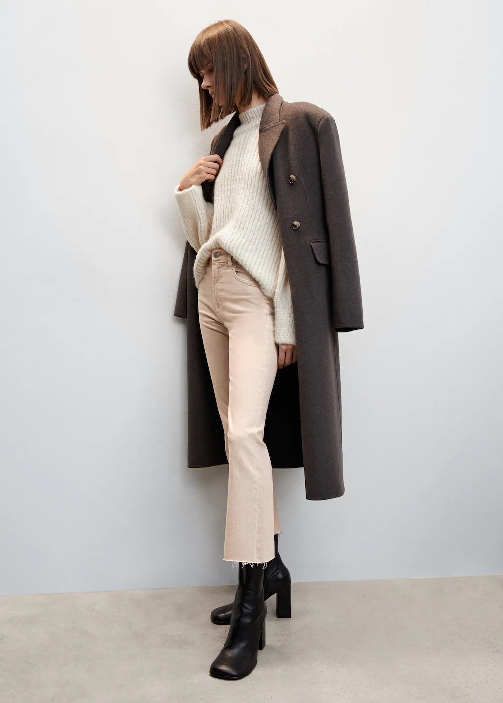 Denim style cotton fabric. Recycled cotton-blend fabric. Elastic. Flared design. Flare design. Cropped design. Frayed hem. High waist. Loops. Five pockets. Zip and one button fastening. Inseam 68 cm.