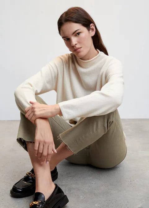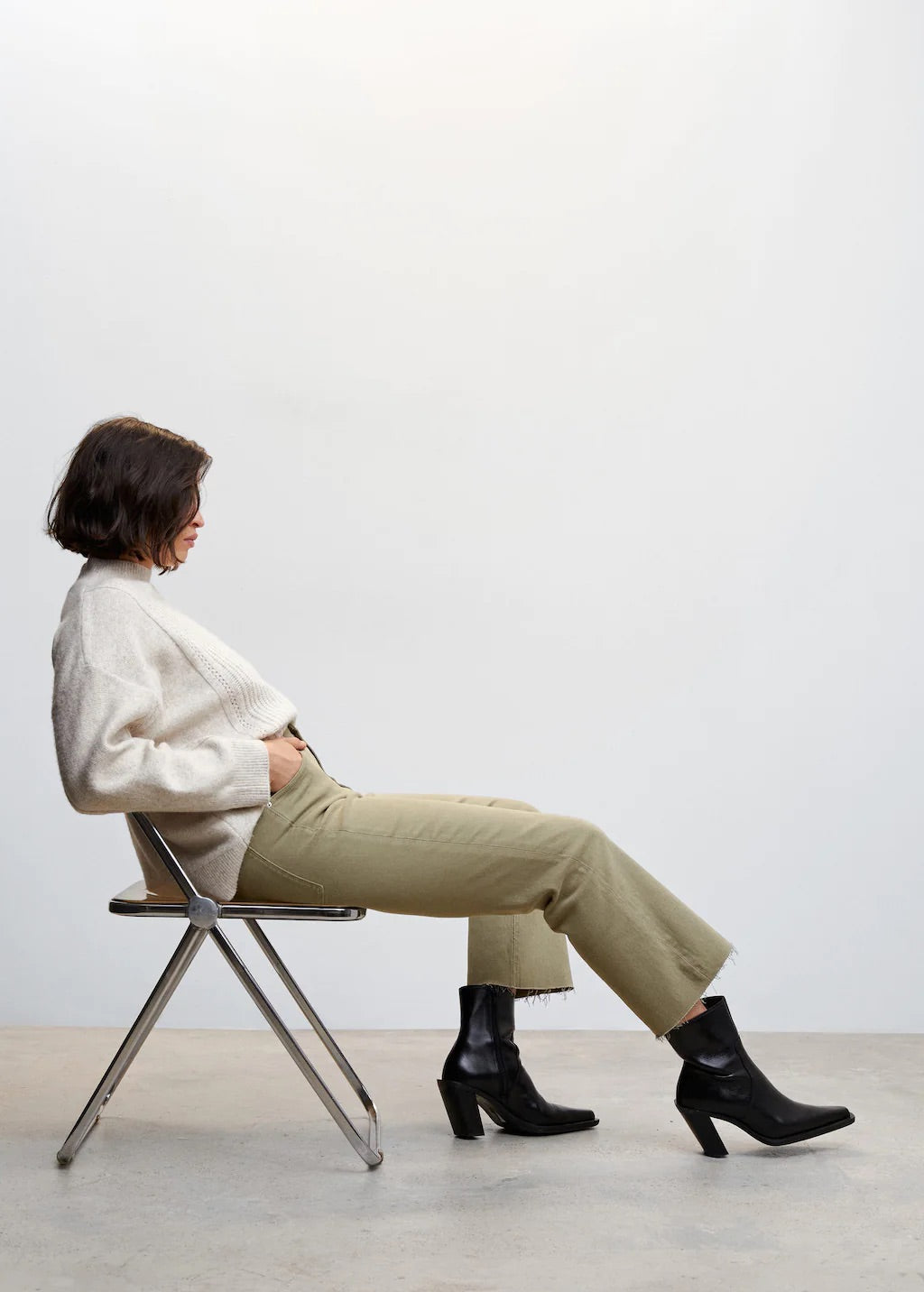 Denim style cotton fabric. Recycled cotton-blend fabric. Elastic. Flared design. Flare design. Cropped design. Frayed hem. High waist. Loops. Five pockets. Zip and one button fastening. Inseam 68 cm.