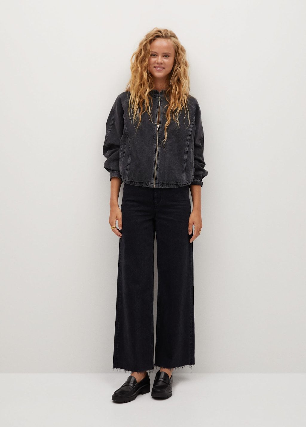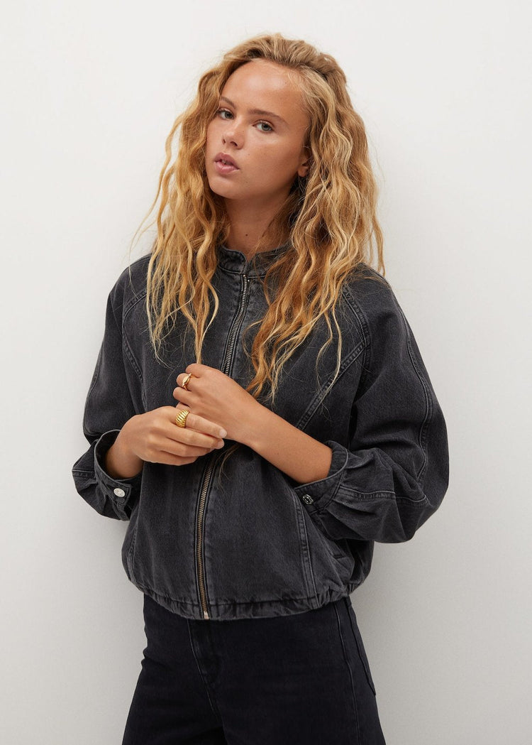 100% Cotton. Bomber design. Rounded neck. Long sleeve with buttoned cuffs. Decorative seams. Side pockets. Elastic hem in back. Zip fastening on the front section. Midi design.
