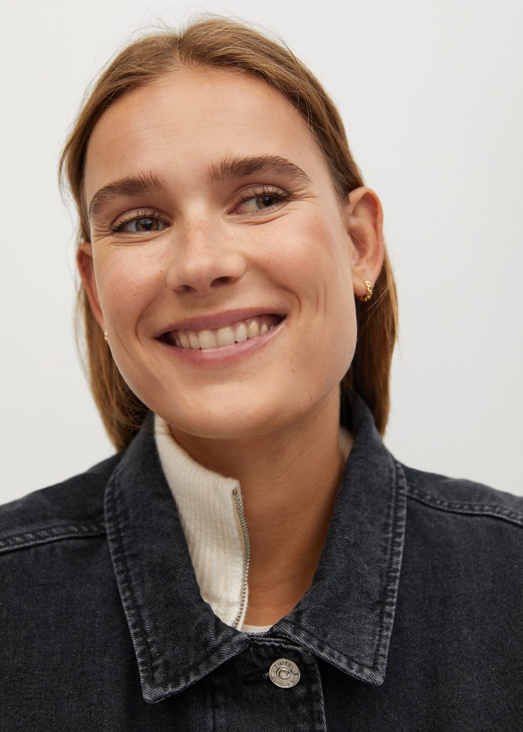 Denim fabric. Bomber design. Midi design. Classic collar. Long sleeve. Two side pockets. Button fastening on the front section.