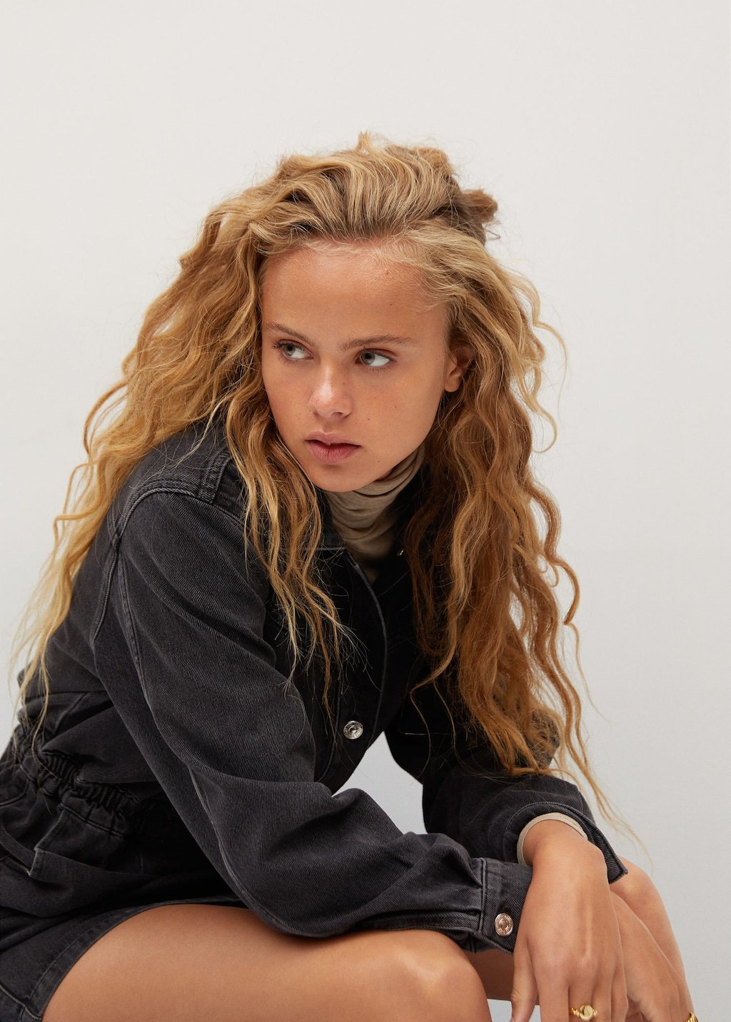 Denim style cotton fabric. Short design. Lapel-collar. Long sleeve with buttoned cuffs. Elastic waist. Button fastening on the front section.