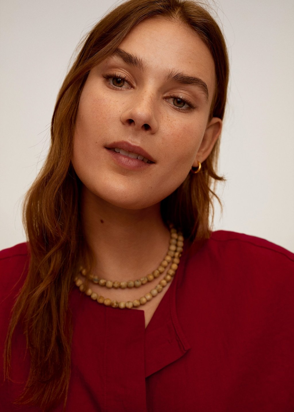 Linen fabric. Rounded neck. Short batwing sleeve. Concealed button fastening.