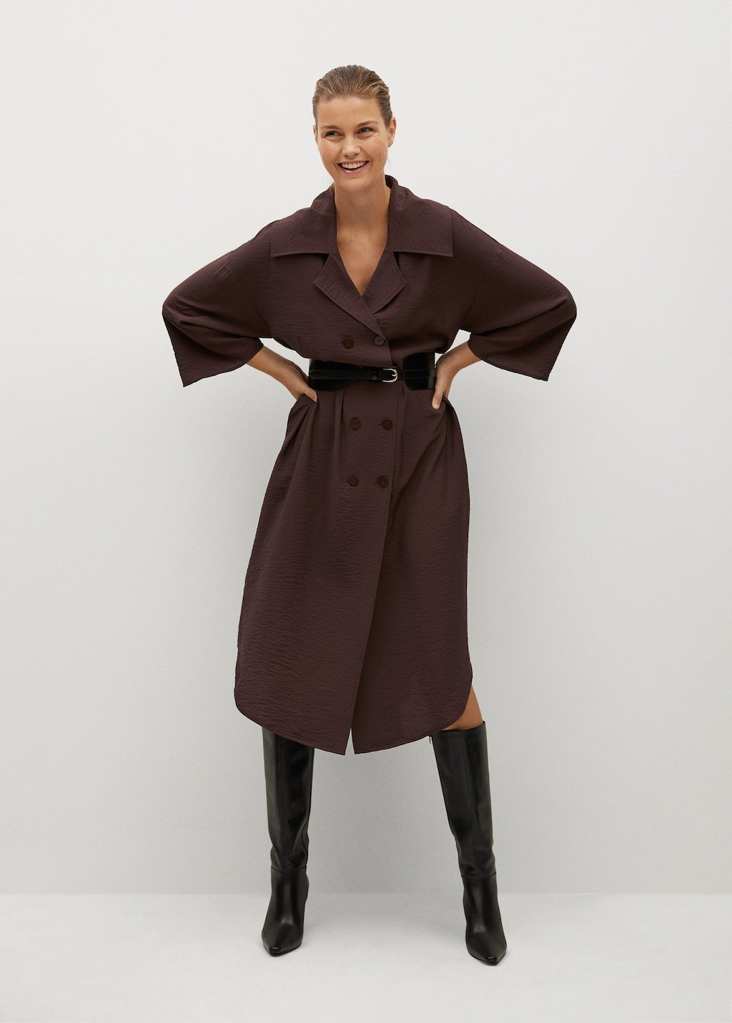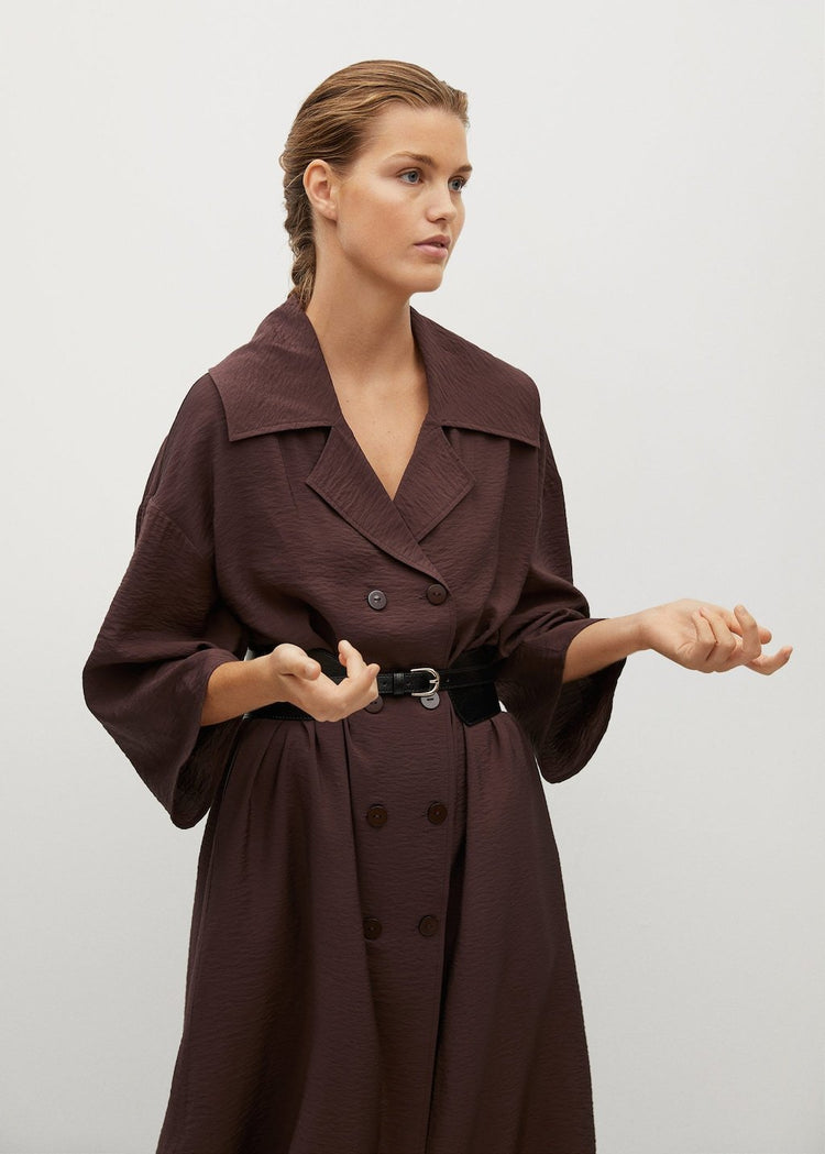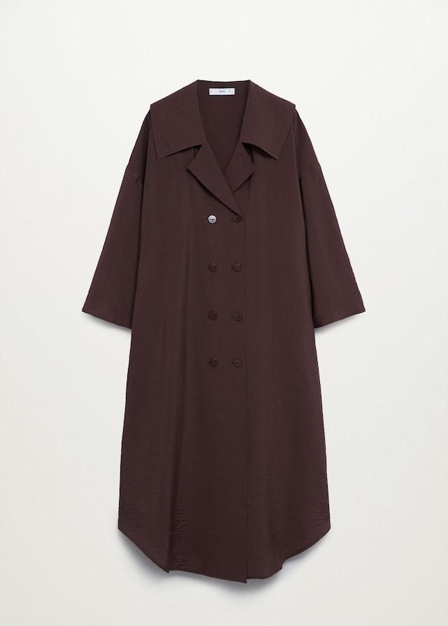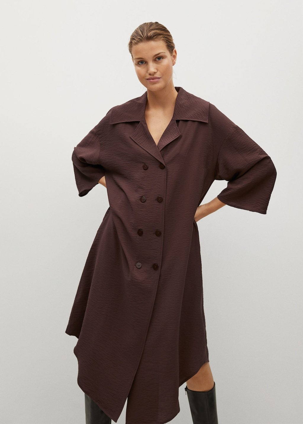 Flowy fabric. Flared design. Lapel-collar. Long sleeve. Double button fastening.