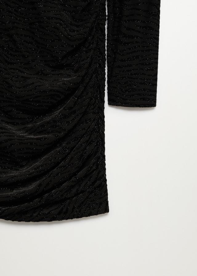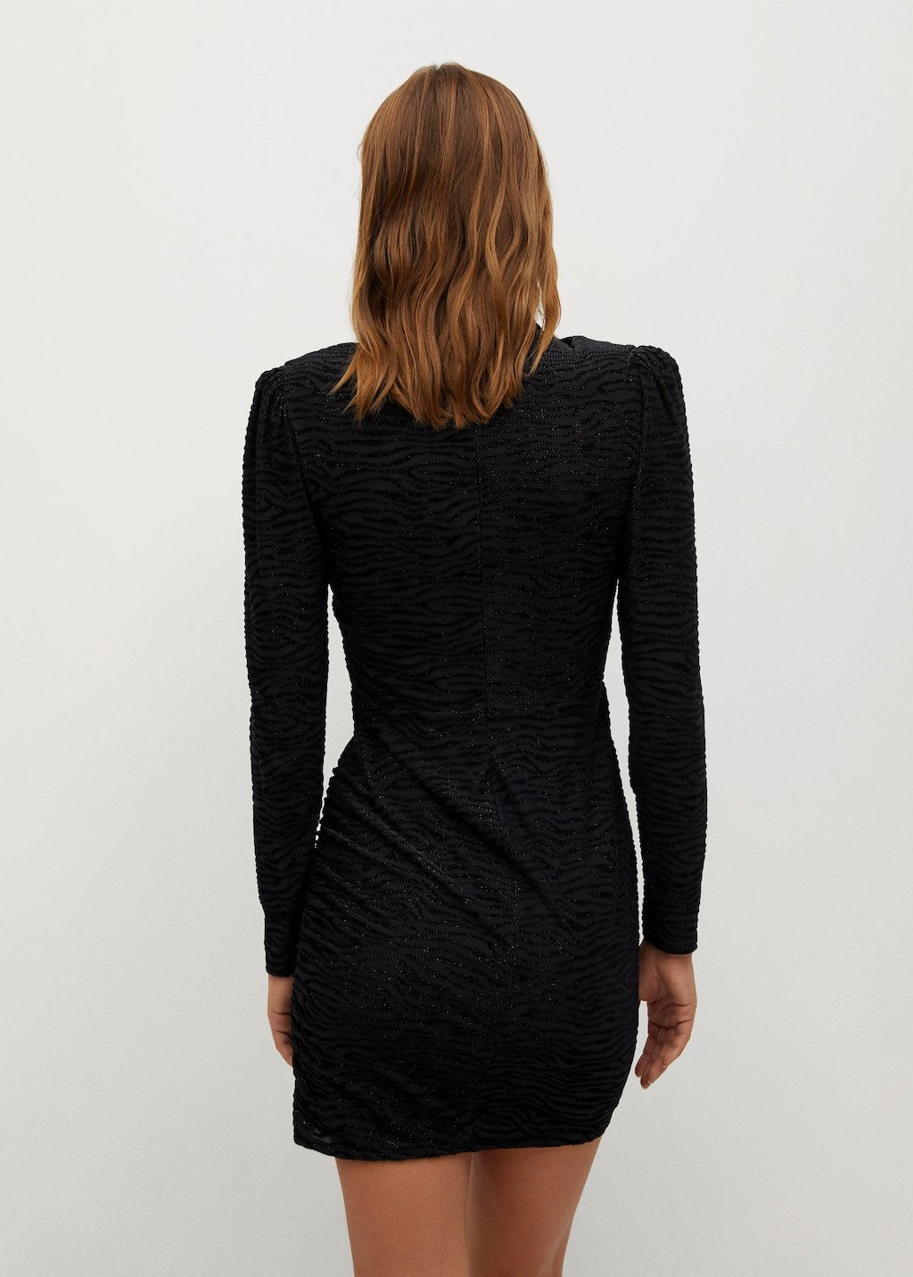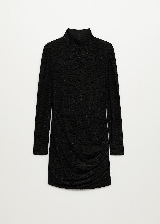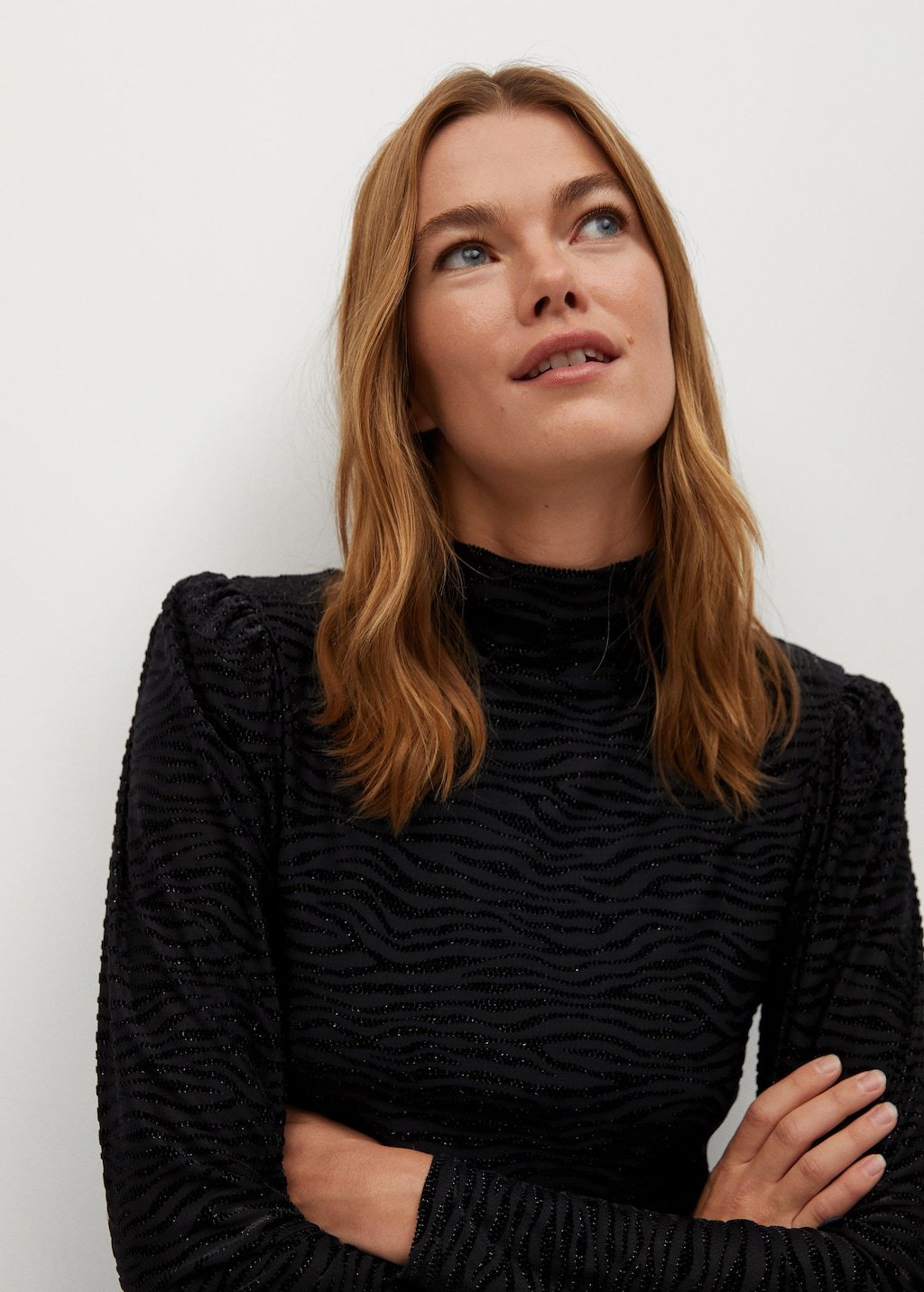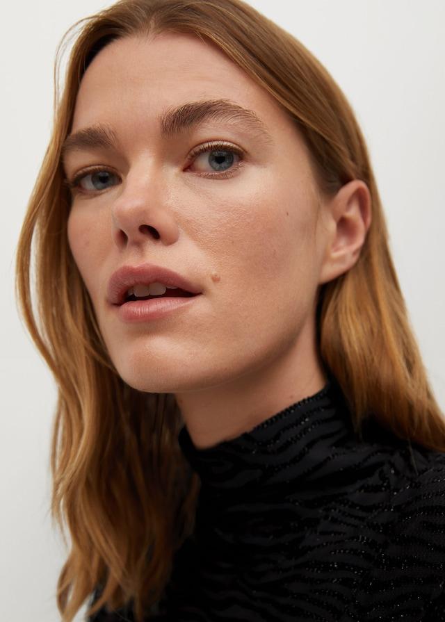 Textured fabric. Shiny finish. Shaved design. Short design. Printed design. Turtleneck. Long sleeve. Zip fastening on the back section. Inner lining.
