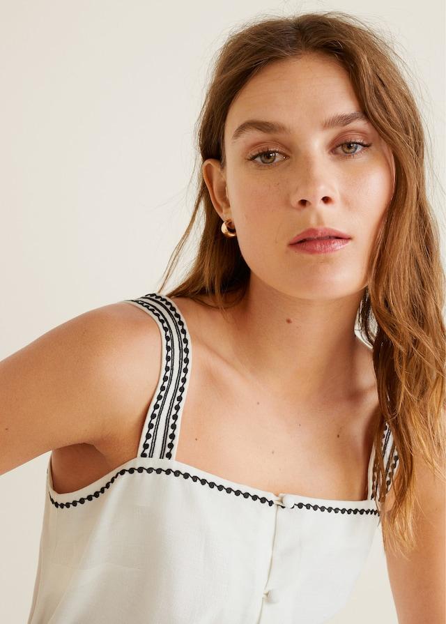 Straight design. Cotton and linen mix. Square neckline. Straps. Embroidered details. Side loops on the waist. Bow on the waist. Button fastening on the front section. Lined buttons.