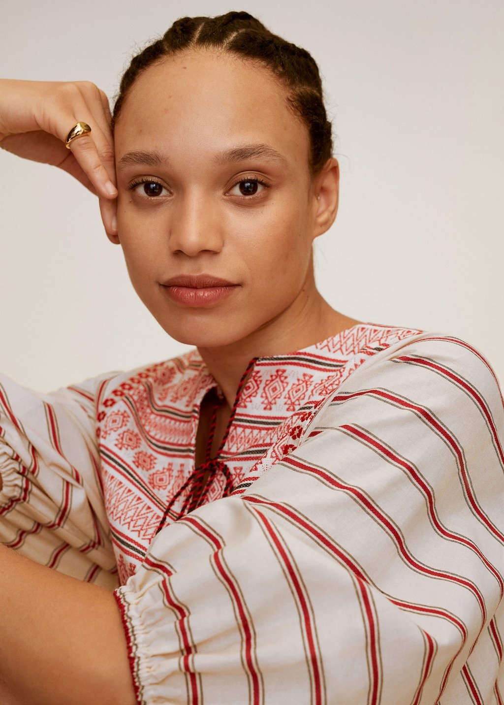 Cotton fabric. Striped print. Thunderbolt print. Midi design. Flared design. Long puffed sleeves. Embroidered details. Bow at the neck.