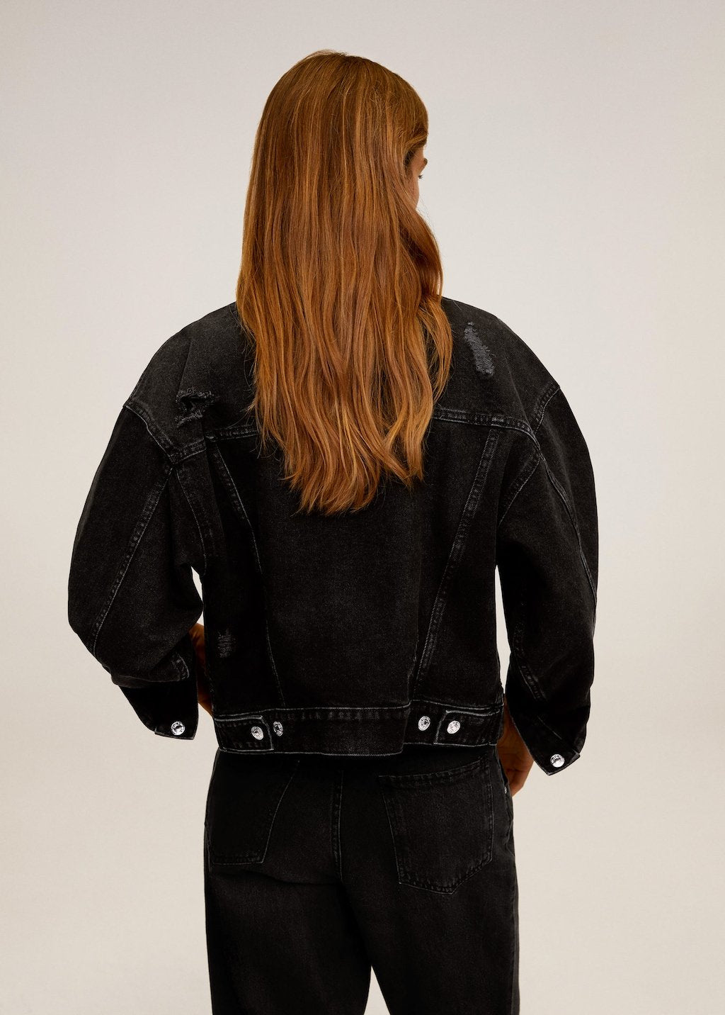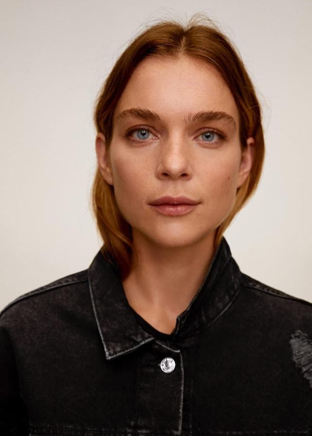Short design. Oversize design. Sustainable cotton fabric. Denim style cotton fabric. Faded. Classic collar. Two patch pockets on the chest. Two side pockets. Long sleeve. Buttoned cuffs. Button up.