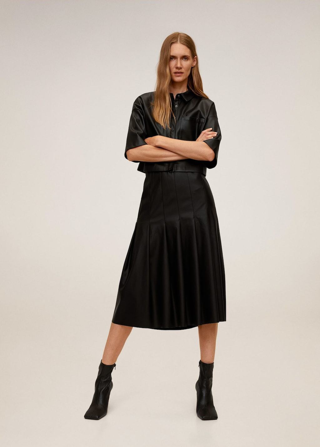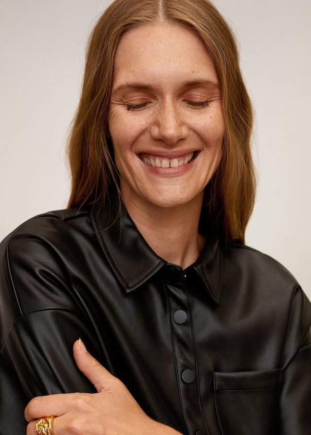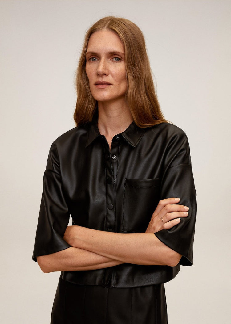 Faux leather. Cropped design. Classic collar. Short sleeve. Dropped shoulder seams. Patch pocket. Button fastening on the front section.