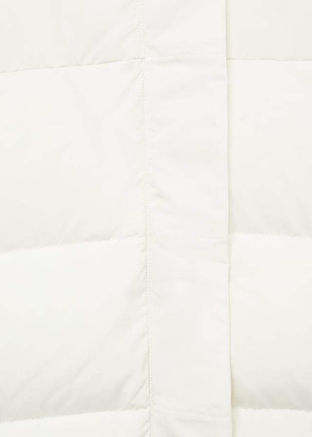 Down filling. Quilted design. Long design. Funnel neck. Long sleeve. Two side pockets. Zip fastening on the front section.
