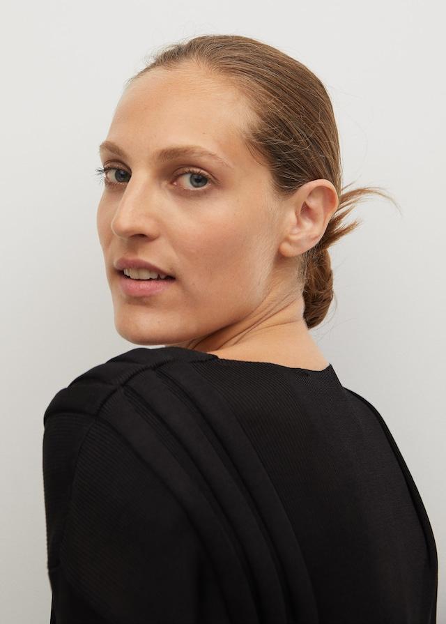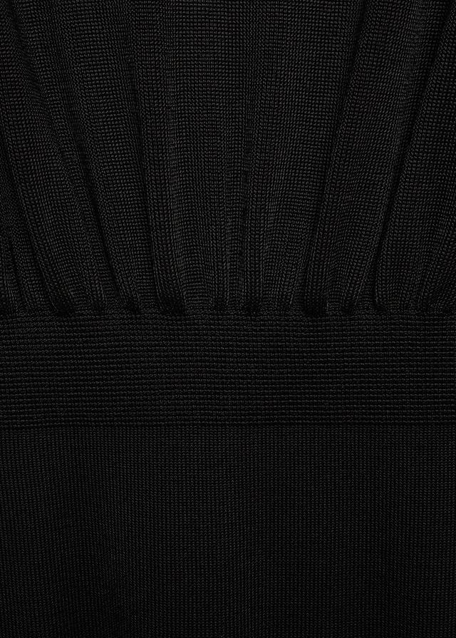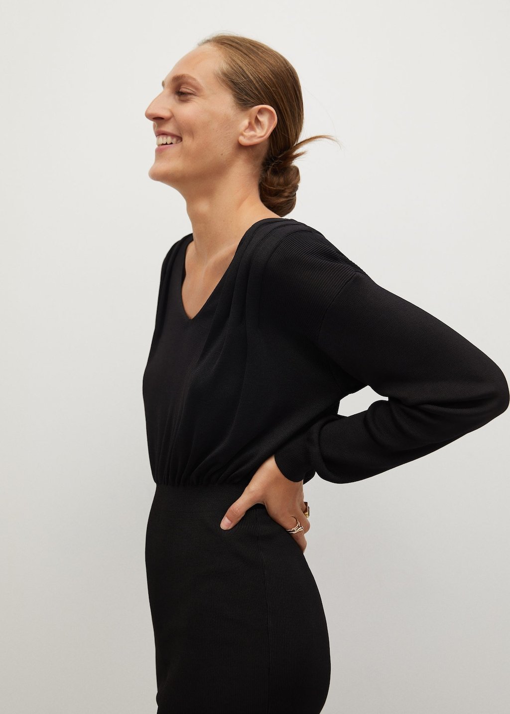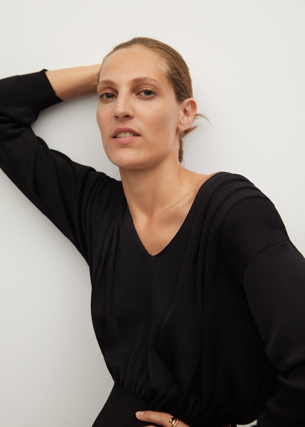 Knitted fabric. Short design. Tailored design. Pleated design. V-neck. Long puffed sleeves. Elastic waist. Cable knit finish.