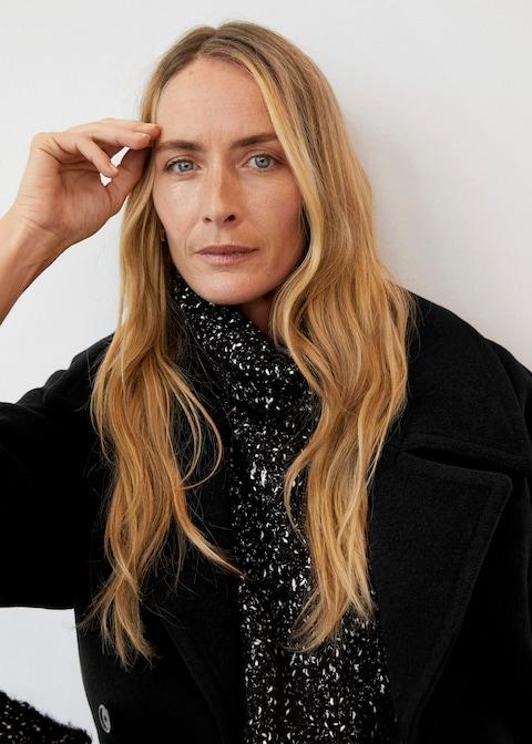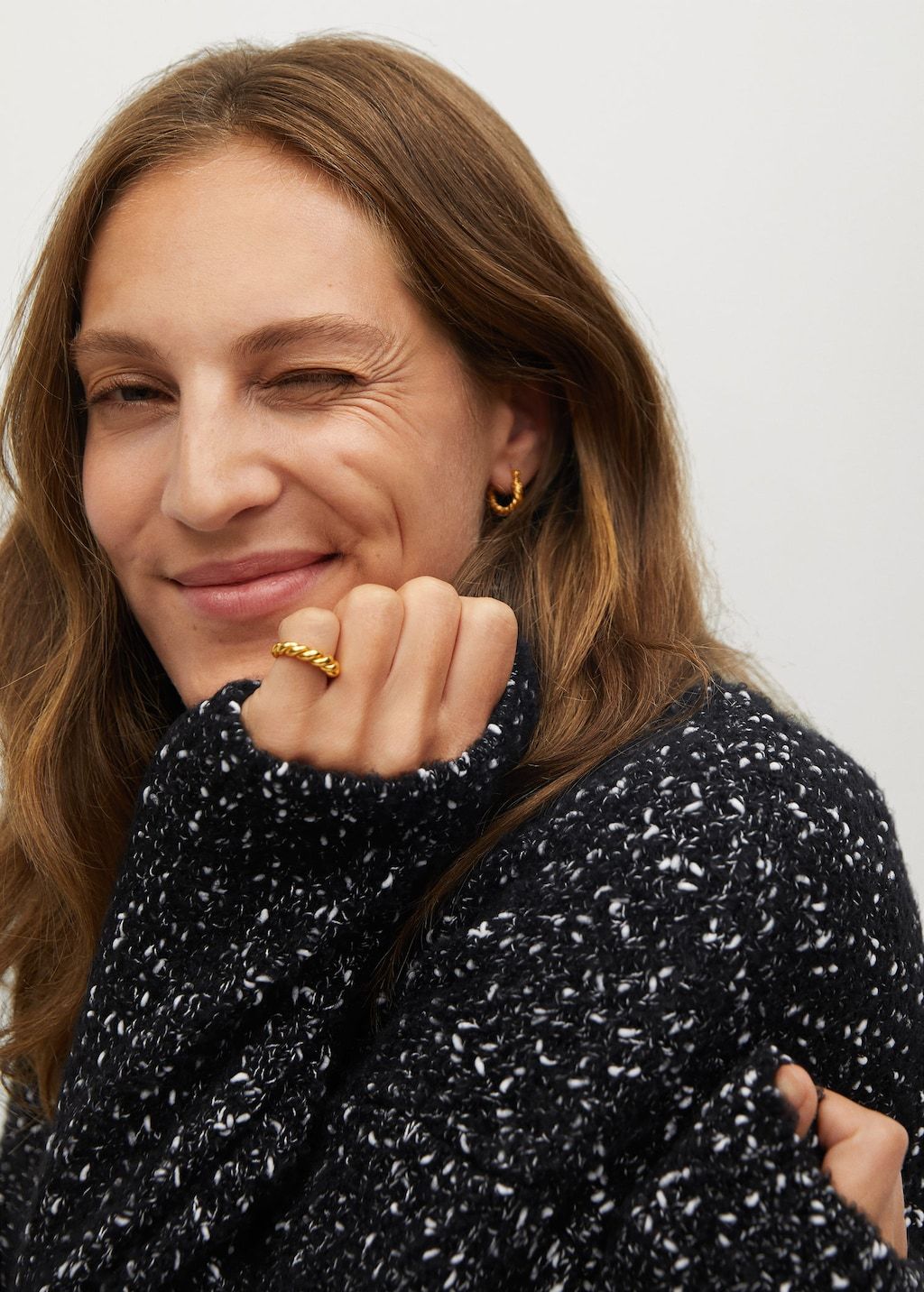 Speckled knit fabric. Short design. Turtleneck. Long sleeve.