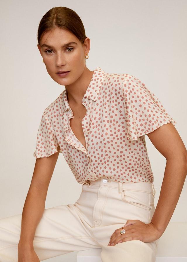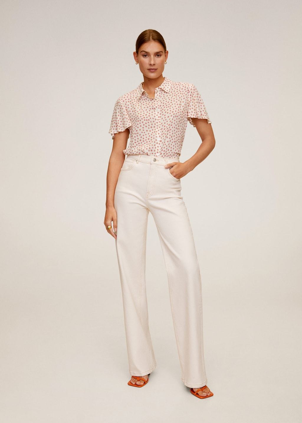 Flowers print. Flowy fabric. Classic collar. Ruffled short sleeve. Button fastening on the front section.