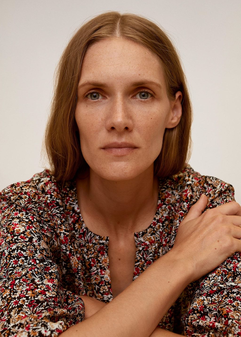 Flowy fabric. Flared design. V-neck. Puffed three quarter sleeves. Elastic cuffs. Elastic waist. Ribbon on the waist with tie closure. Frill on the bottom. Button fastening on the front section.