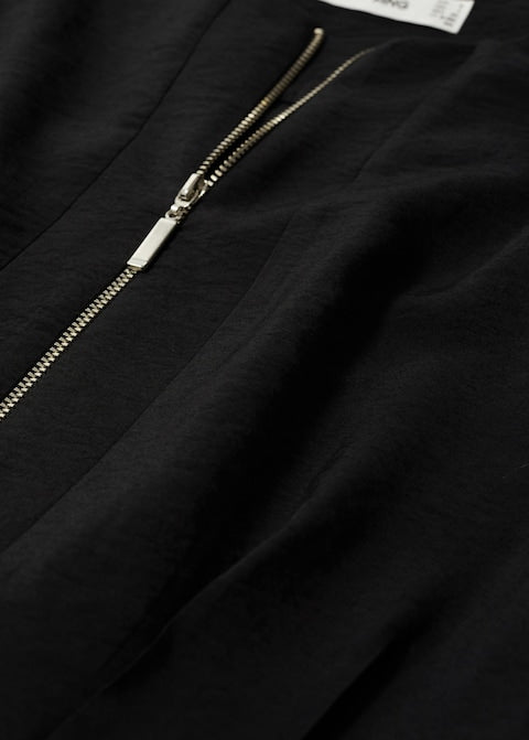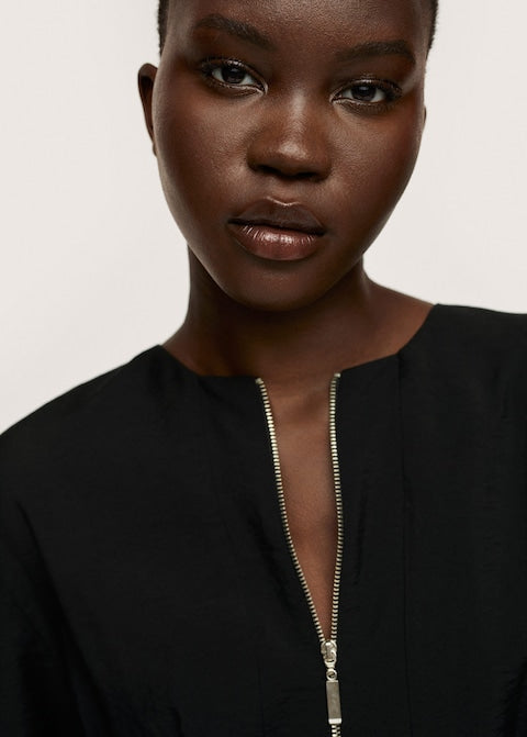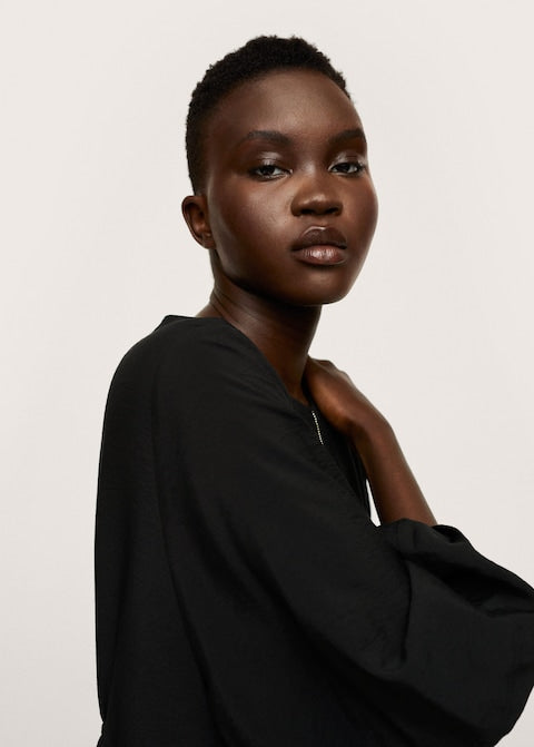 Modal-blend fabric. Textured fabric. Straight design. Midi design. Round neck with zip fastening. Long puffed sleeves. Dart detail on the cuffs. Dart detail.