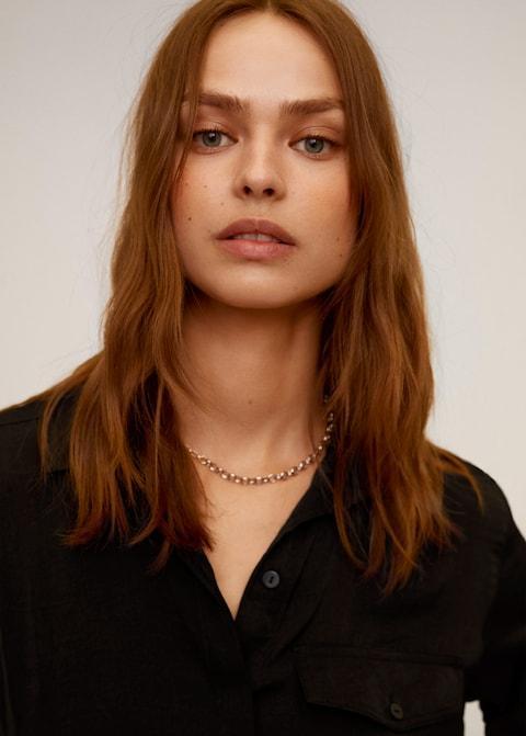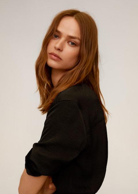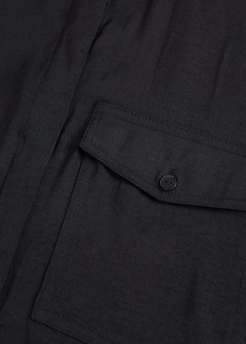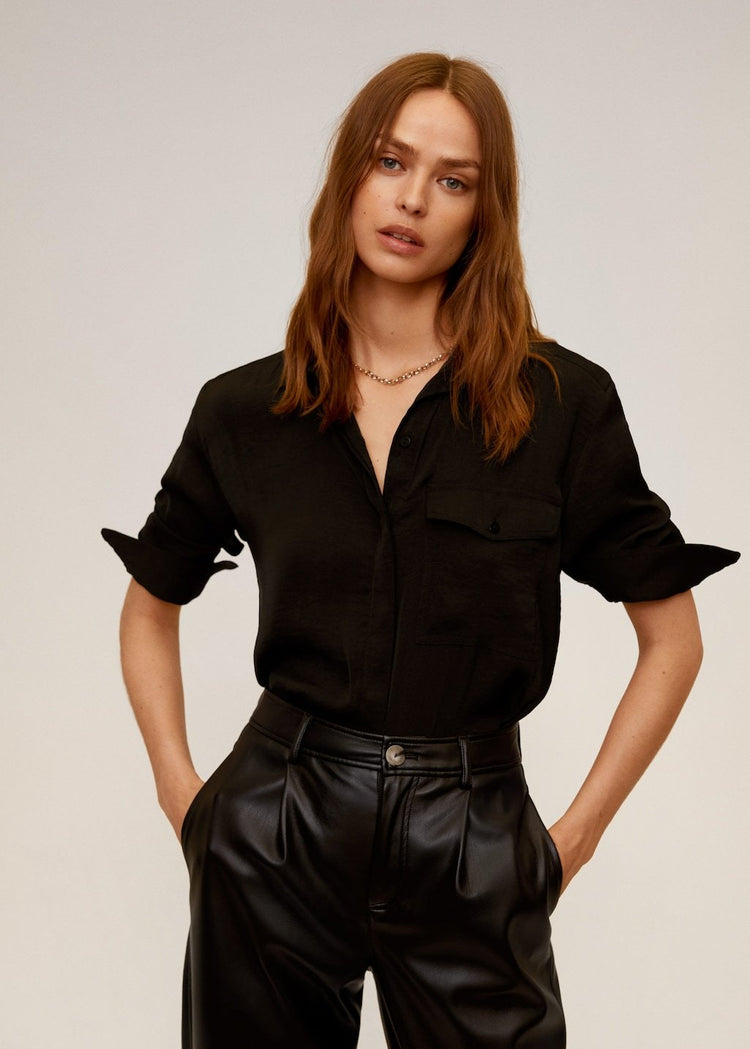 Flowy fabric, satin finish, classic collar, buttoned pocket with flap on the front section, long sleeve, buttoned cuffs, button up.