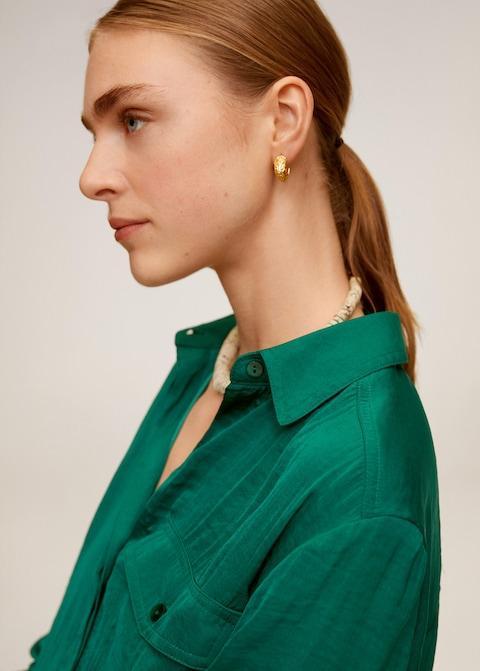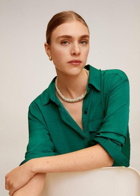 Flowy fabric, satin finish, classic collar, buttoned pocket with flap on the front section, long sleeve, buttoned cuffs, button up.