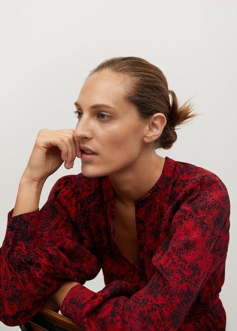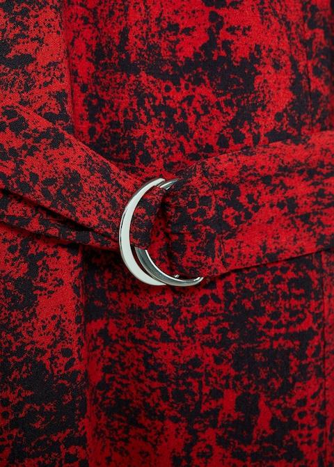 Flowy fabric. Printed design. Midi design. Rounded neck. Long puffed sleeves. Buttoned cuffs. Loops. Removable printed belt. Side slits. Flared design.