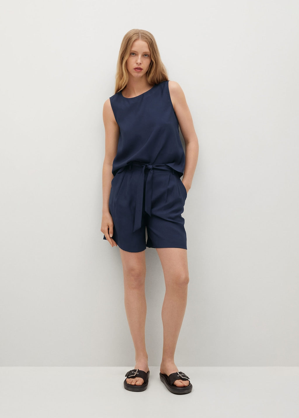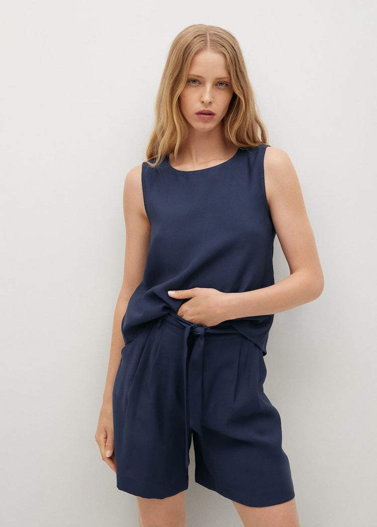Flowy fabric. Straight design. Rounded neck. Sleeveless. Teardrop fastening at back.