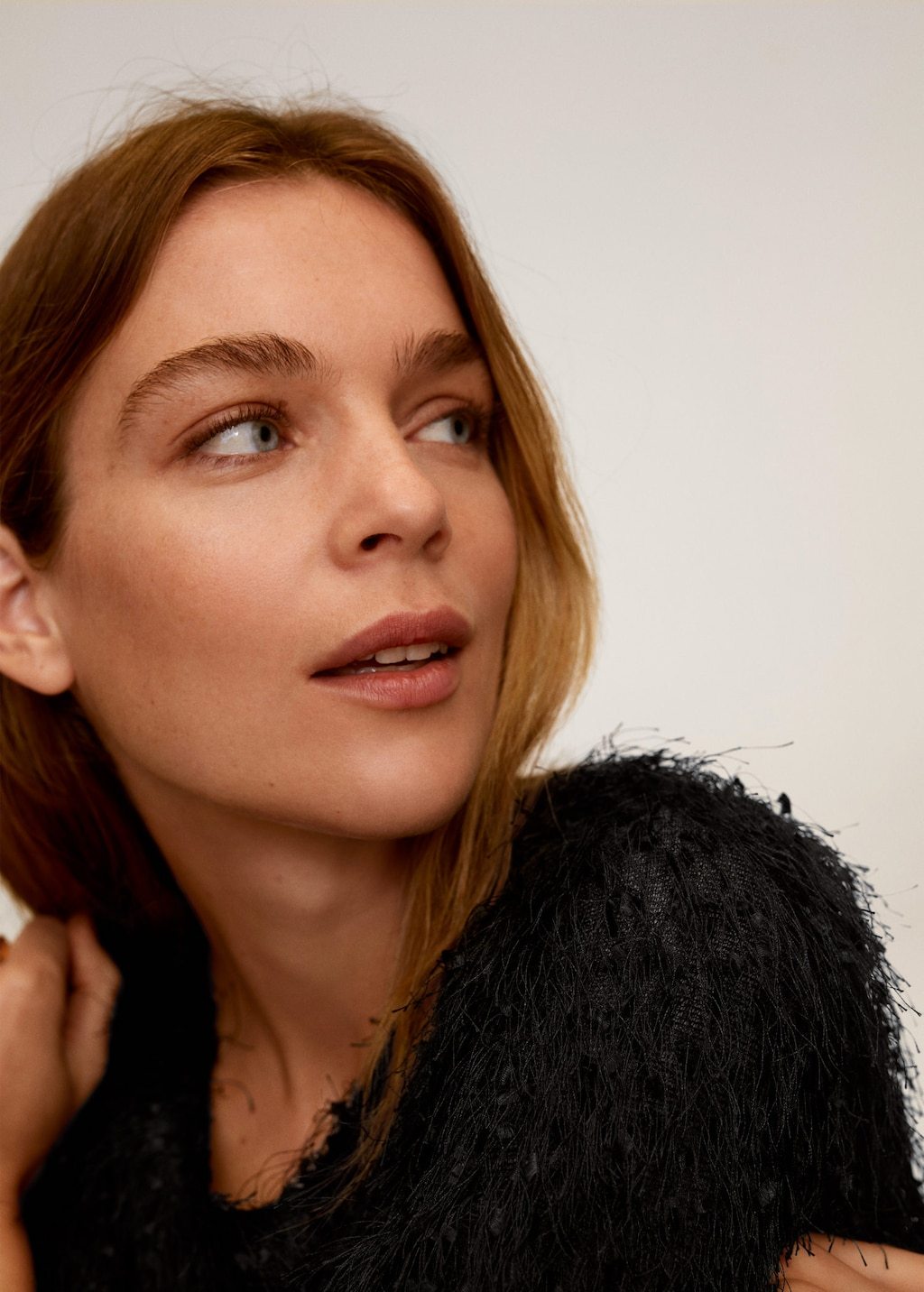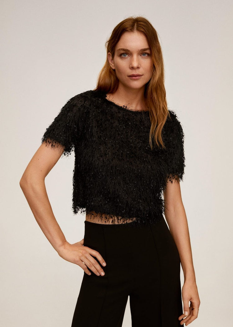 Cropped design. Rounded neck. Short sleeve. Frayed finish.