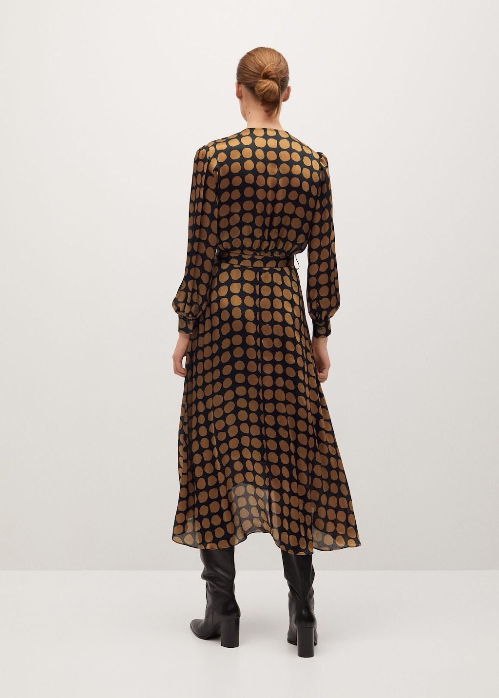 Flowy fabric. Geometric print. Midi design. Crossover design. Crossed V-neck. Long puffed sleeves. Buttoned cuffs. Loops. Removable printed belt. Frill detail on the back section.