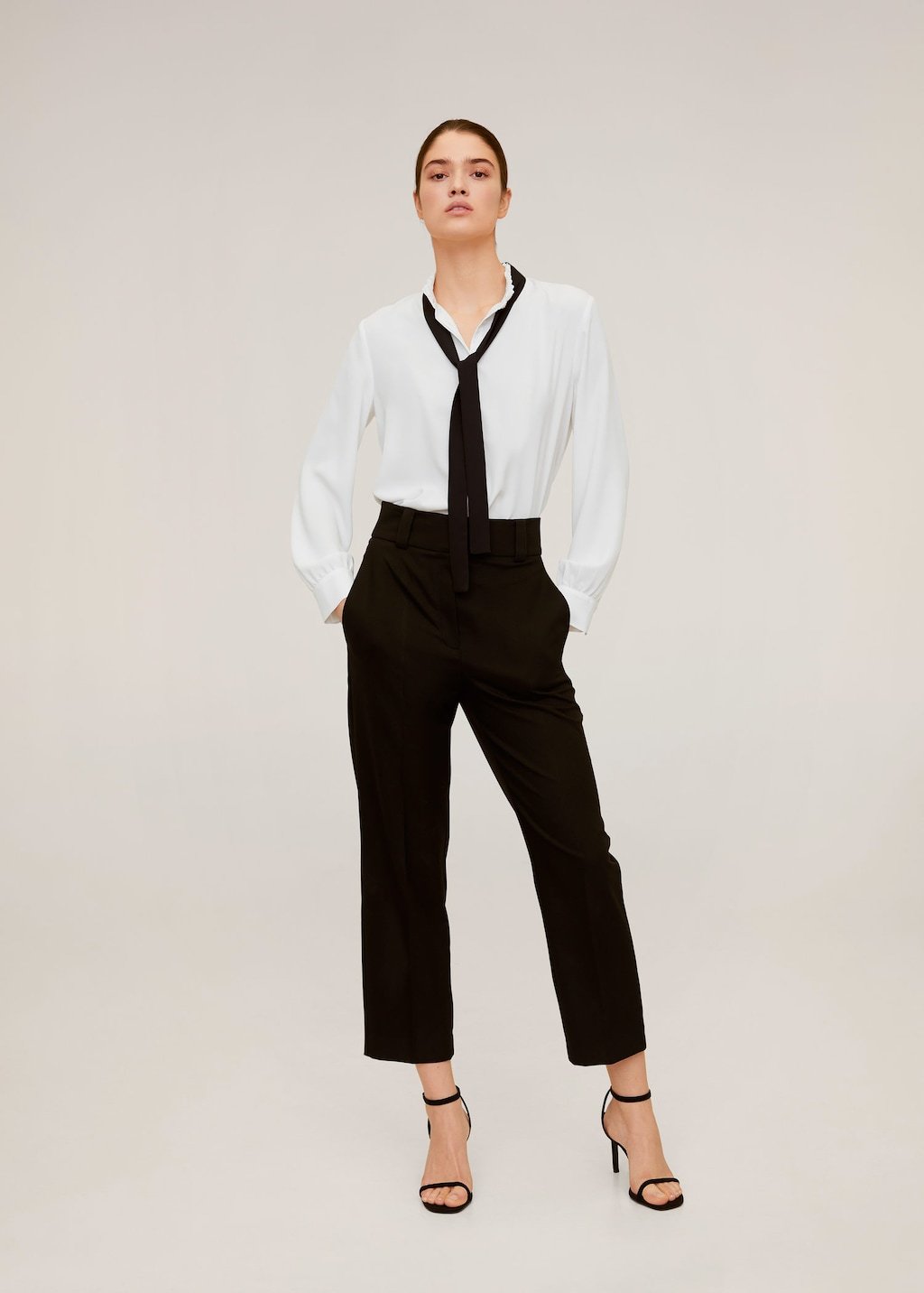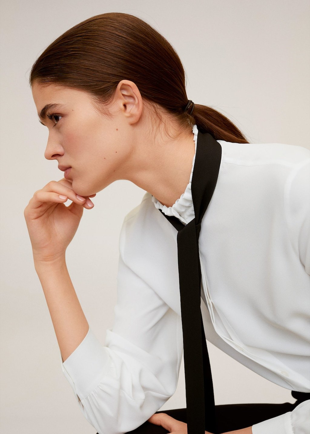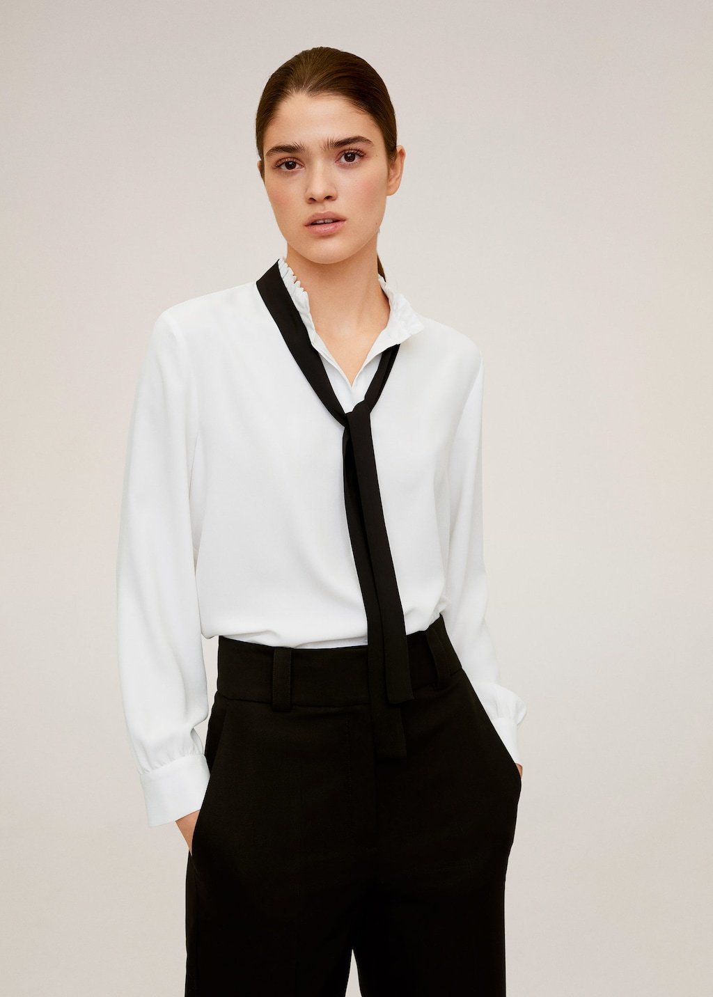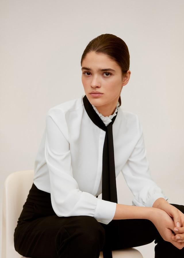 Flowy fabric, gathered detail on the neck, bow at the neck, long sleeve, buttoned cuffs, button fastening on the front section.