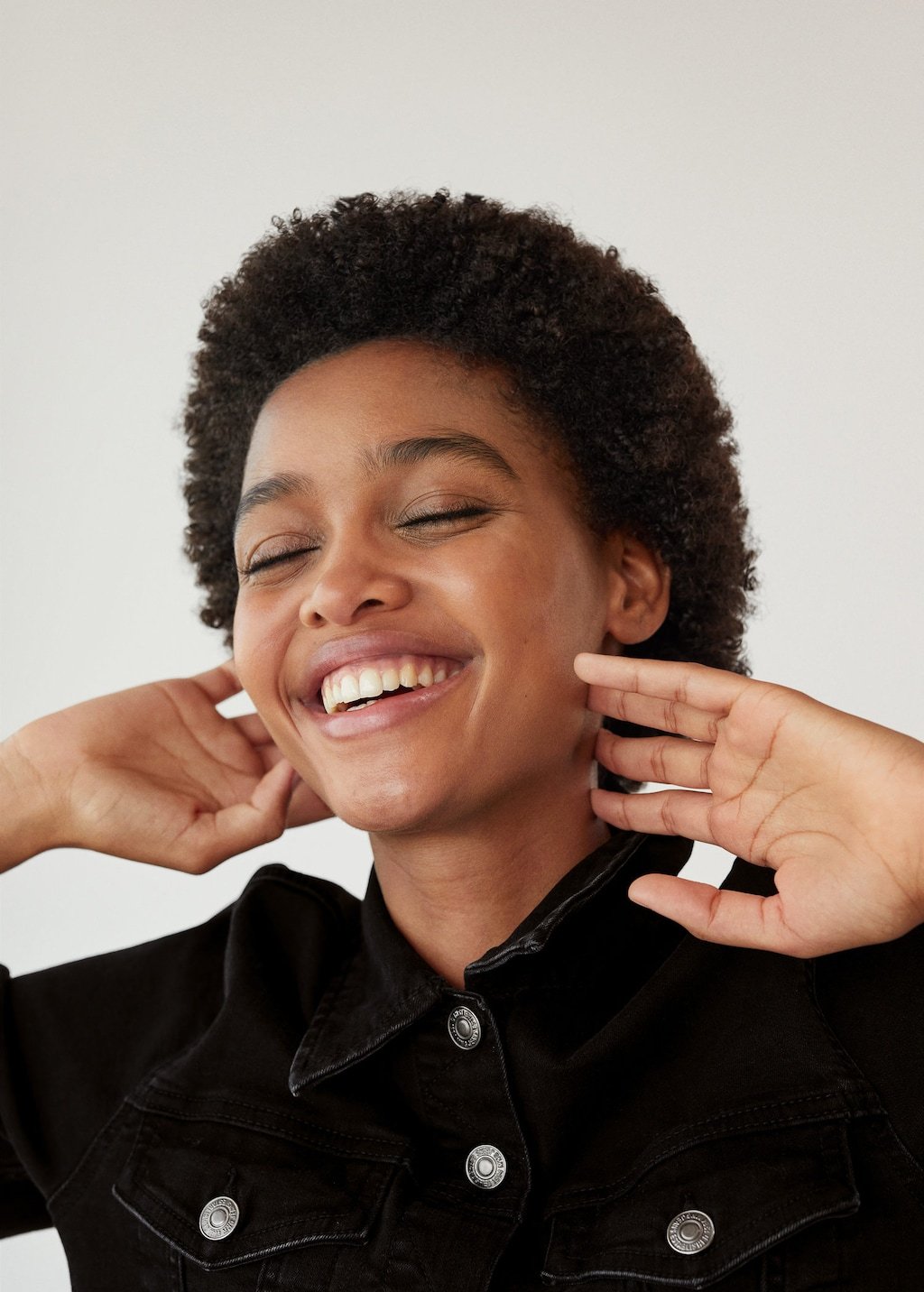 Short design. Sustainable cotton fabric. Black. Classic collar. Twin buttoned flap pockets at front. Two side pockets. Long sleeve. Buttoned cuffs. Loops on the waist. Button up.