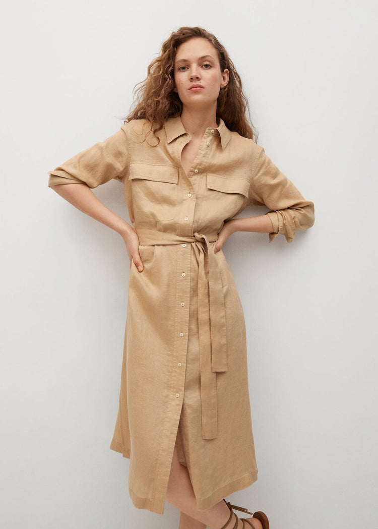 Committed Collection. 100% Linen. Midi design. Straight design. Shirt-style collar. Long sleeve with buttoned cuffs. Adjustable belt. Loops. Side slit hem. Two front pockets. Button up.