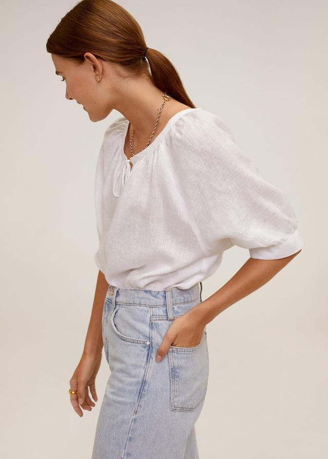 100% linen. Rounded neck. Three quarter sleeve. Cord fastening.
