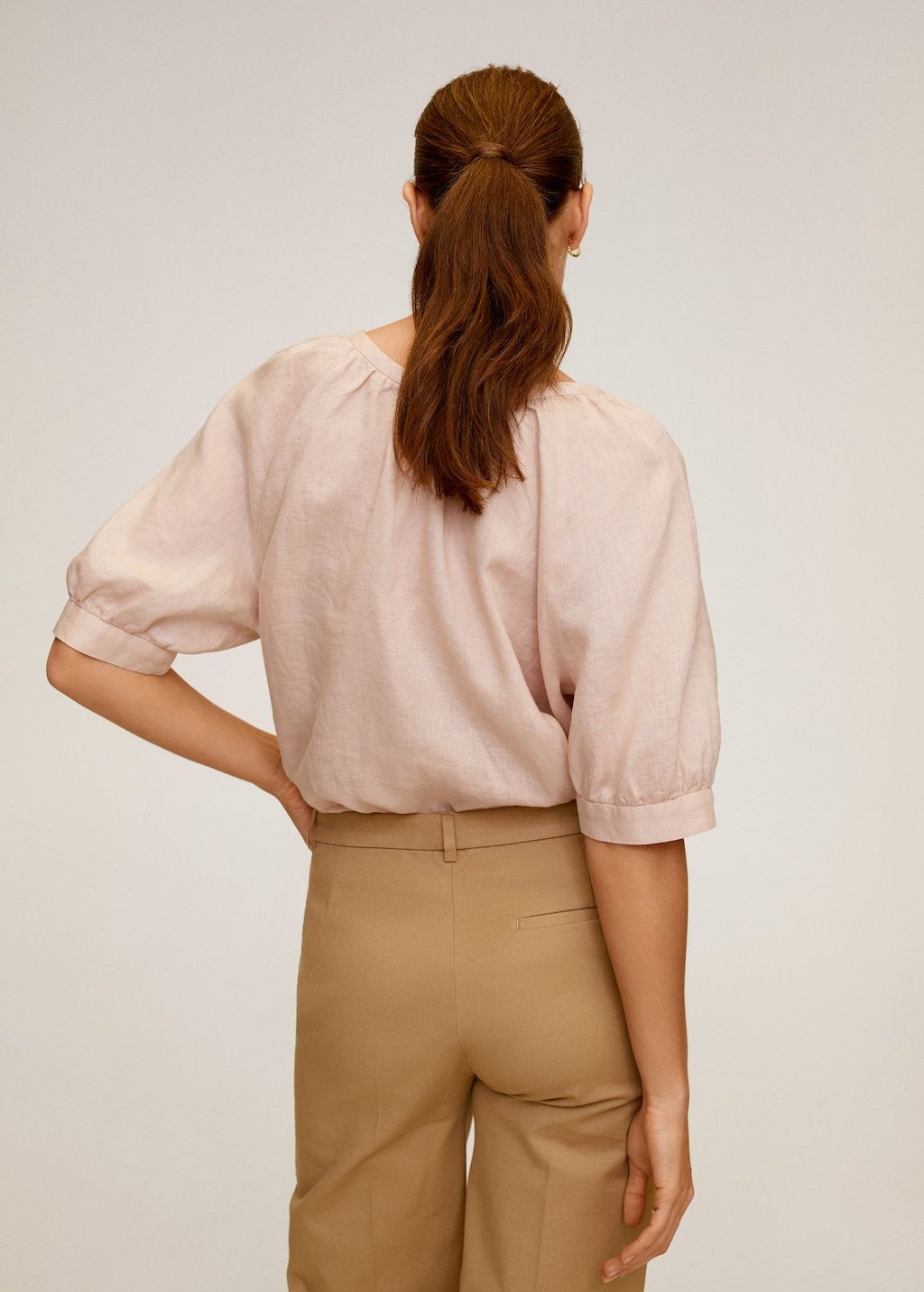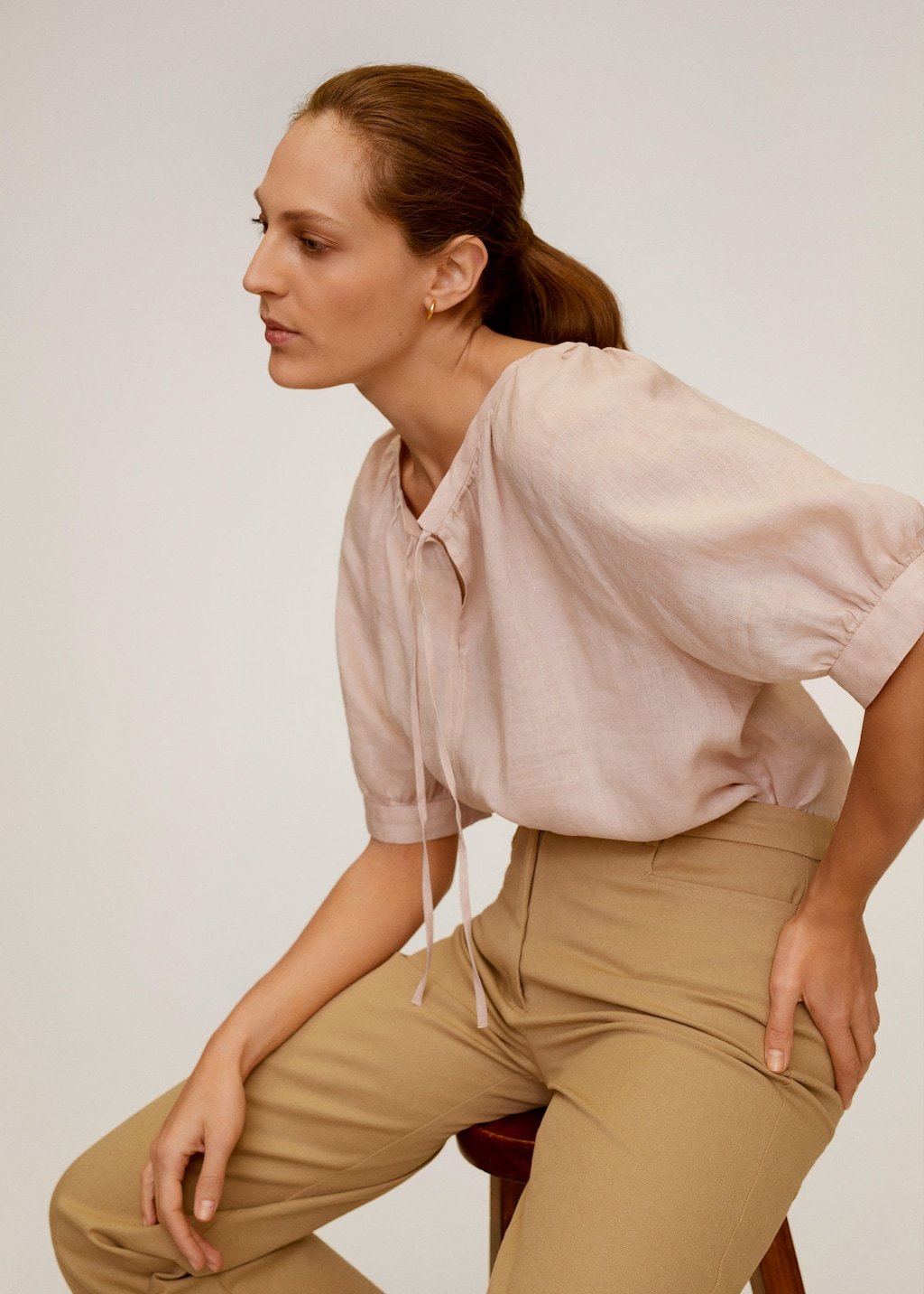 100% linen. Rounded neck. Three quarter sleeve. Cord fastening.