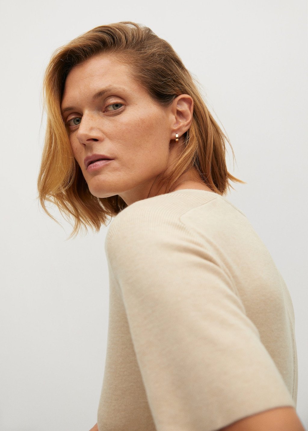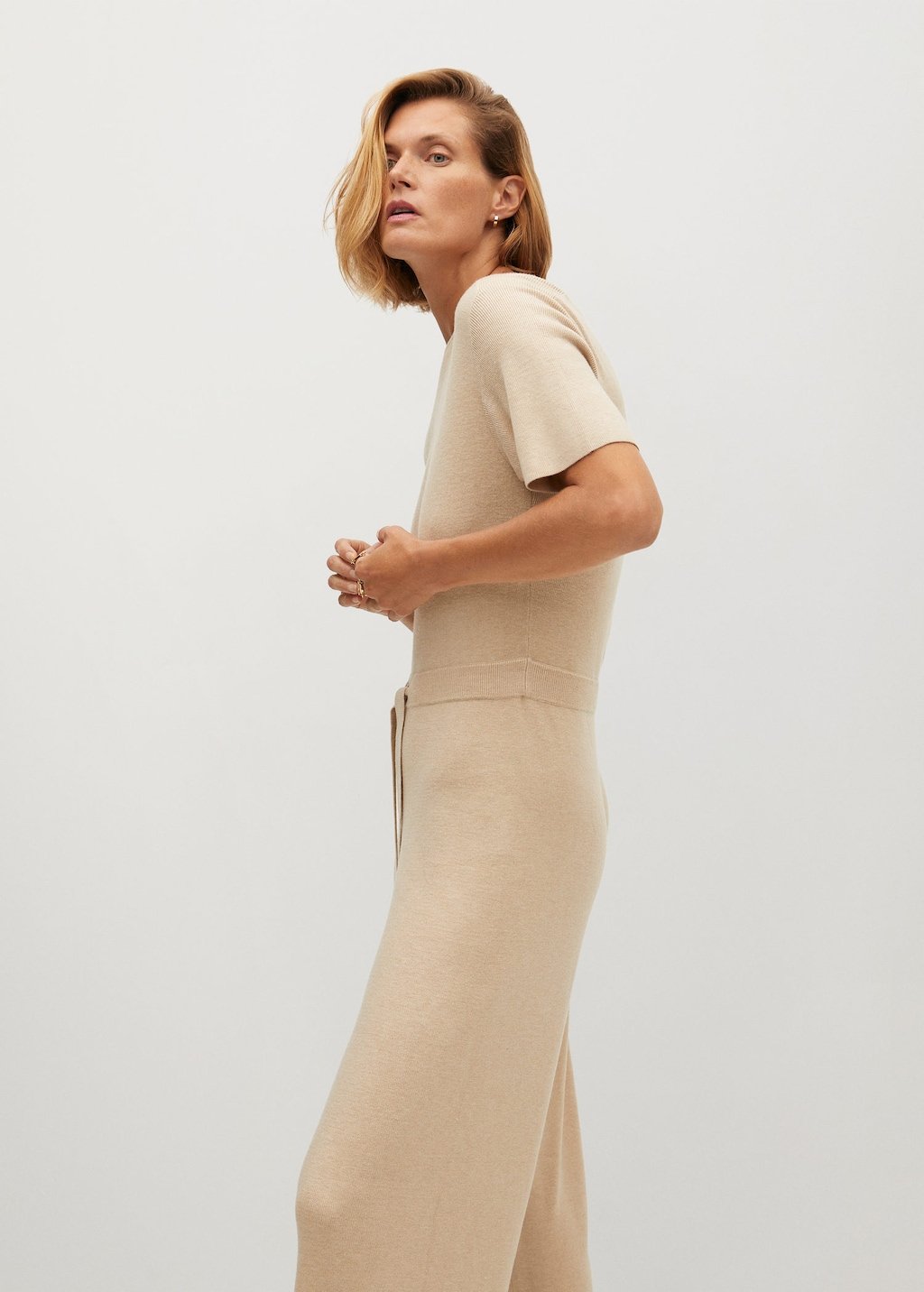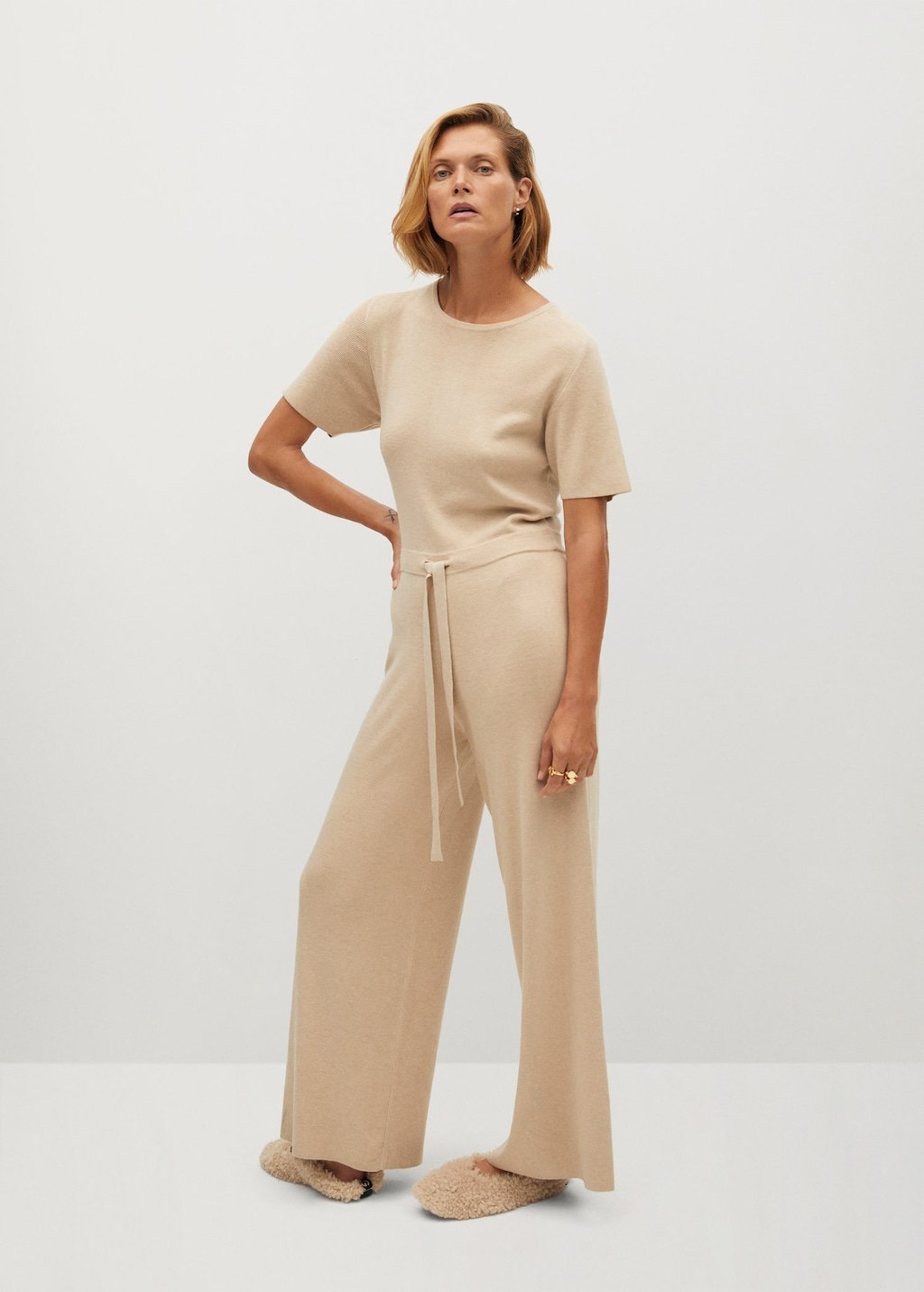 Knitted fabric. Rounded neck. Short sleeve. Straight fit. Adjustable bows fastening.