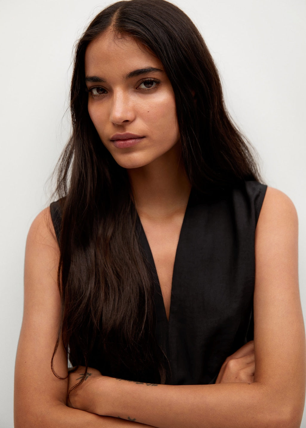 Committed Collection. Lyocell fabric. Midi design. Flared design. V-neck. Sleeveless. Decorative belt. Zip fastening on the back section.