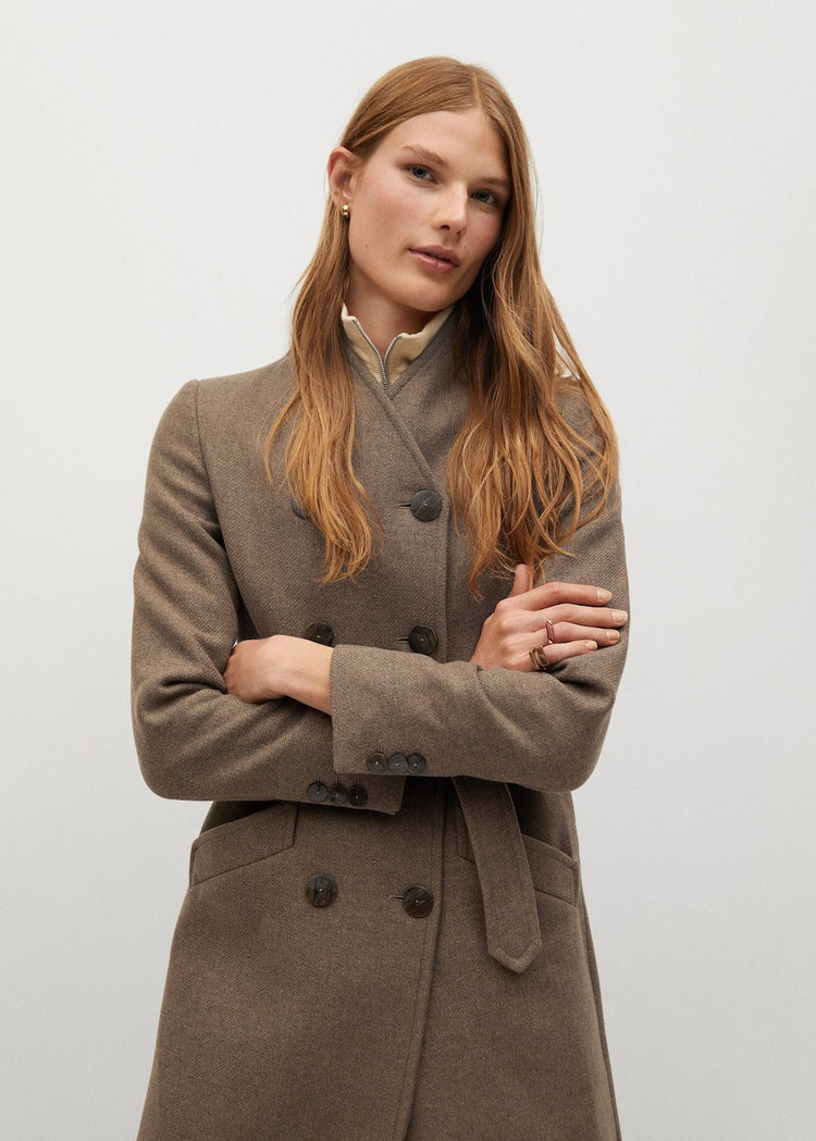 Italian fabric with Manteco wool. Fabric with recycled wool. Long design. Crossover design. Funnel neck. Long sleeve with buttoned cuffs. Side pockets. Loops. Removable belt. Button fastening on the front section. Inner lining.