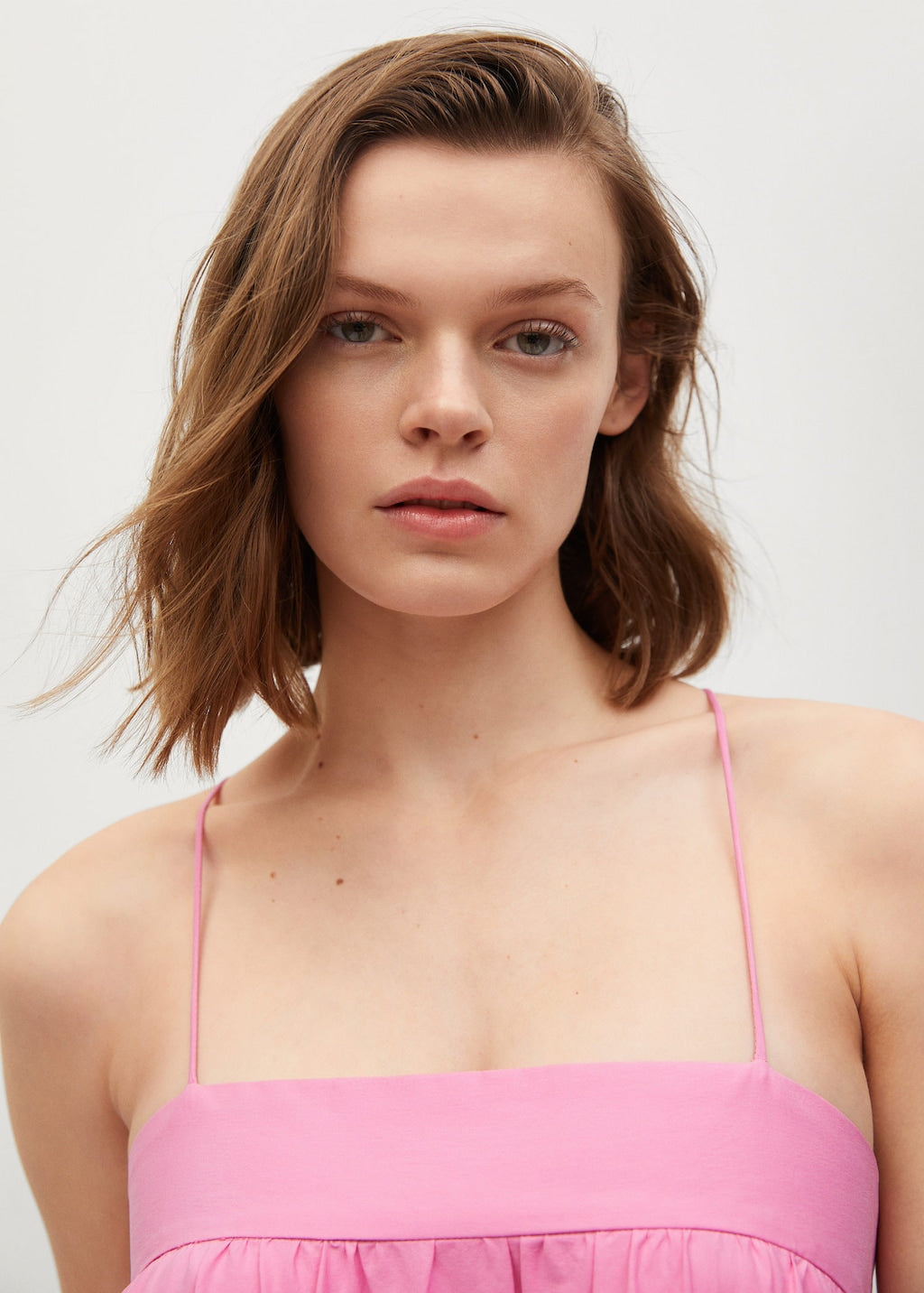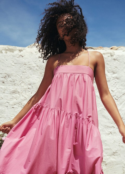 Committed Collection. 100% Cotton. Flowy fabric. Maxi dress design. Long design. Flared design. Printed design. Straight neck. Thin crossover straps. Pleated details. Frill on the bottom.