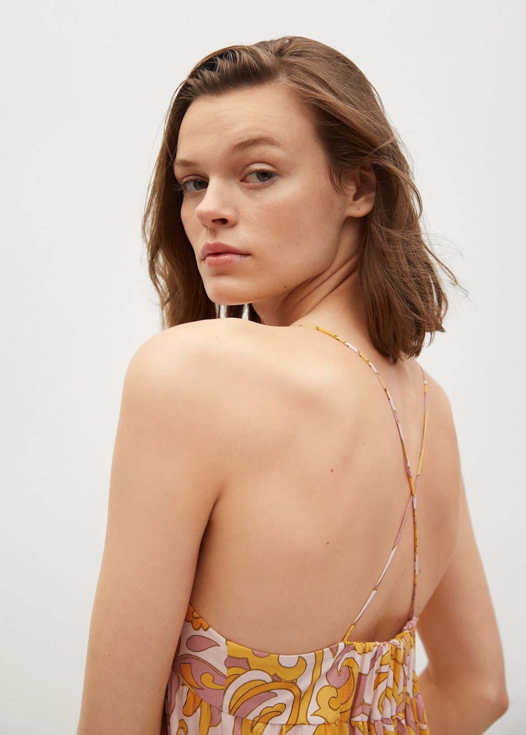 Committed Collection. 100% Cotton. Flowy fabric. Maxi dress design. Long design. Flared design. Printed design. Straight neck. Thin crossover straps. Pleated details. Frill on the bottom.