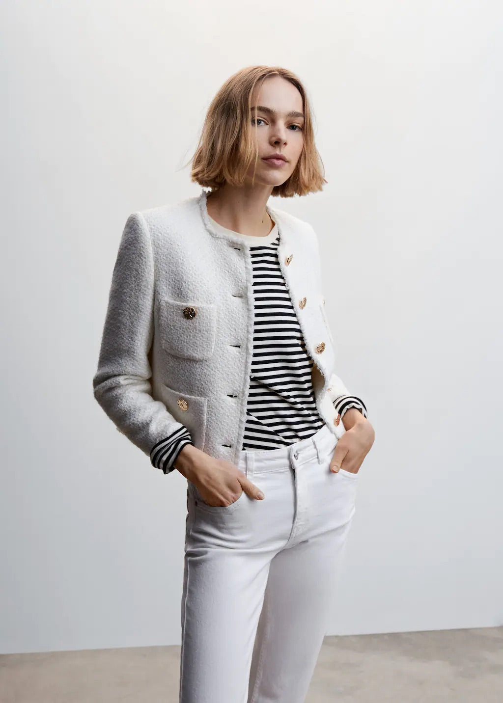 Denim style cotton fabric. Long design. Straight design. Medium waist. Zip and one button fastening. Two side pockets. Two patch pockets on the back. Loops. Inside length 79 cm.