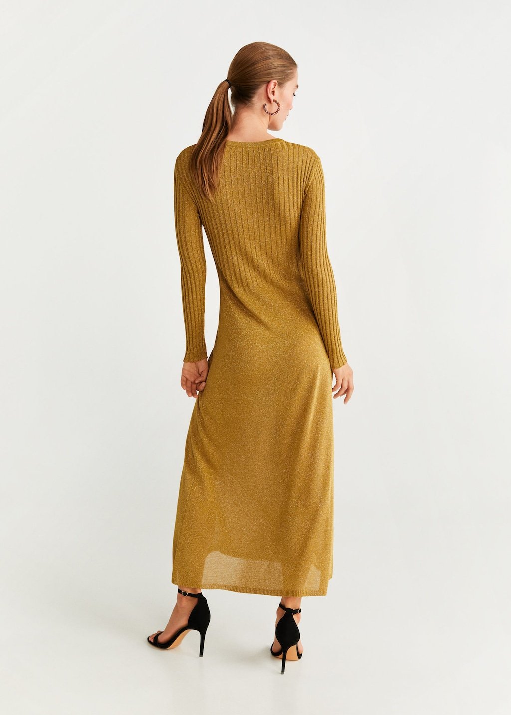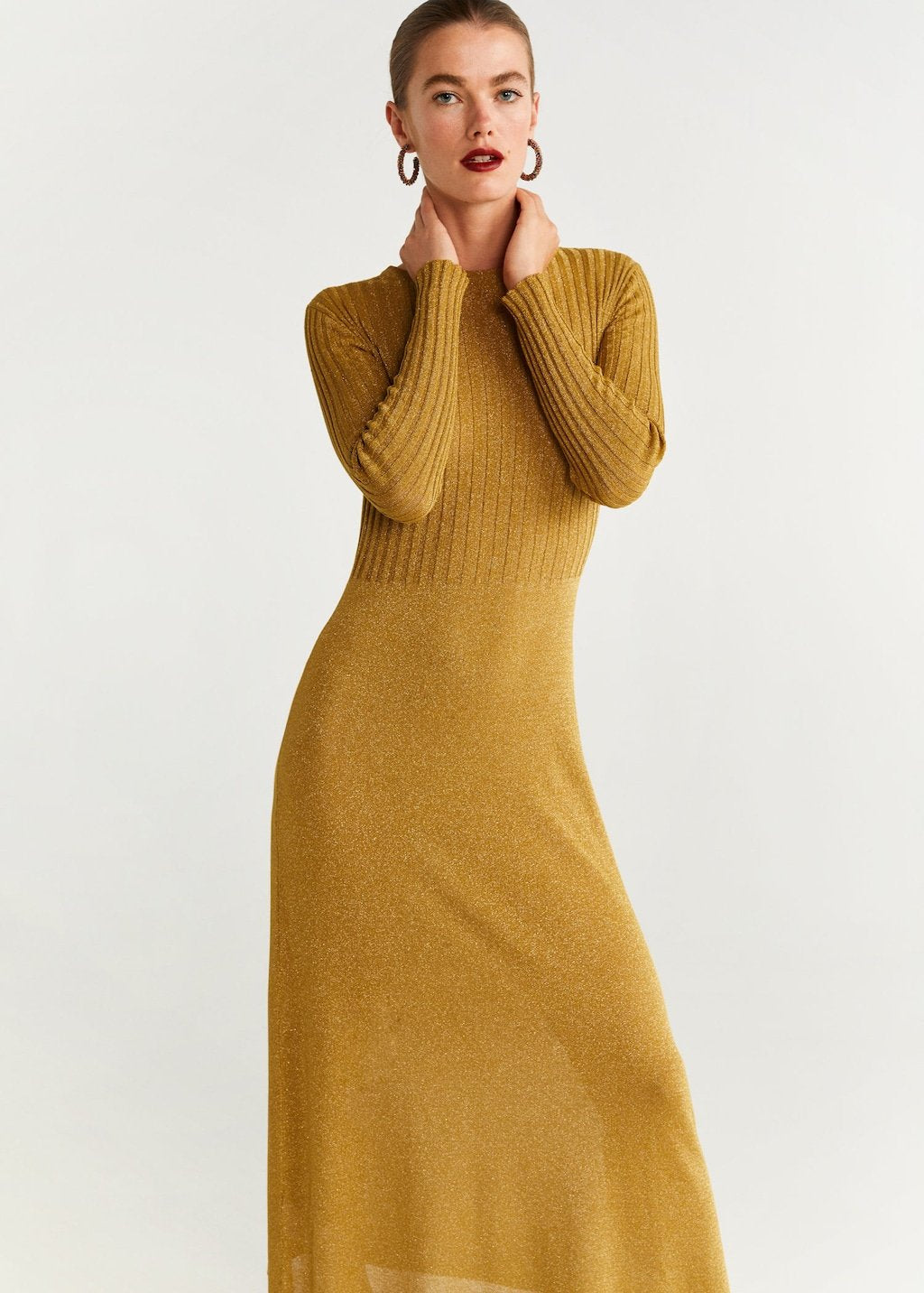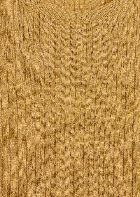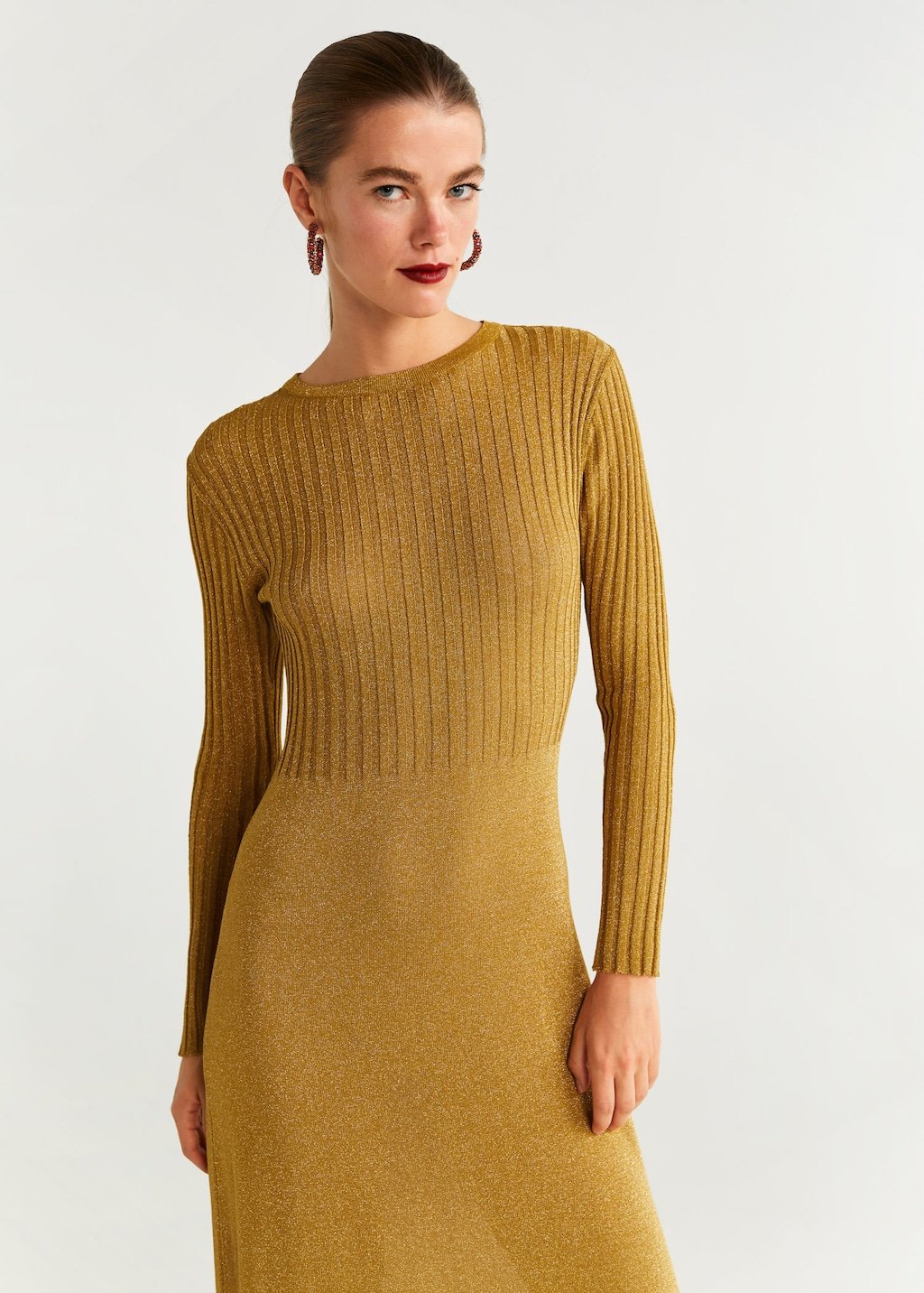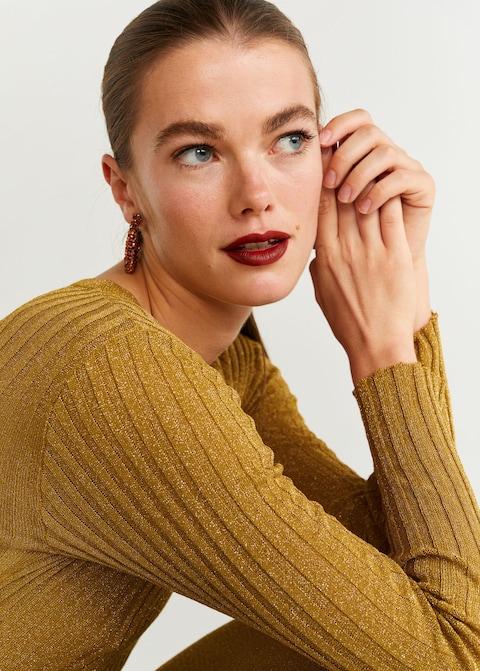 Online Exclusive. Tailored design. Fabric with metallic thread. Cable knit panel. Rounded neck. Long sleeve.