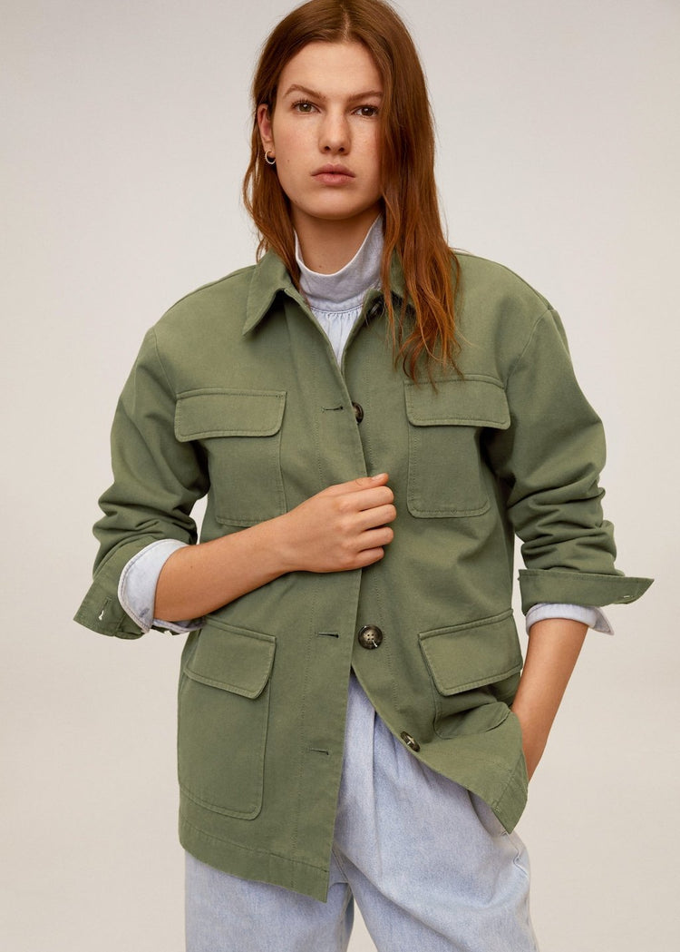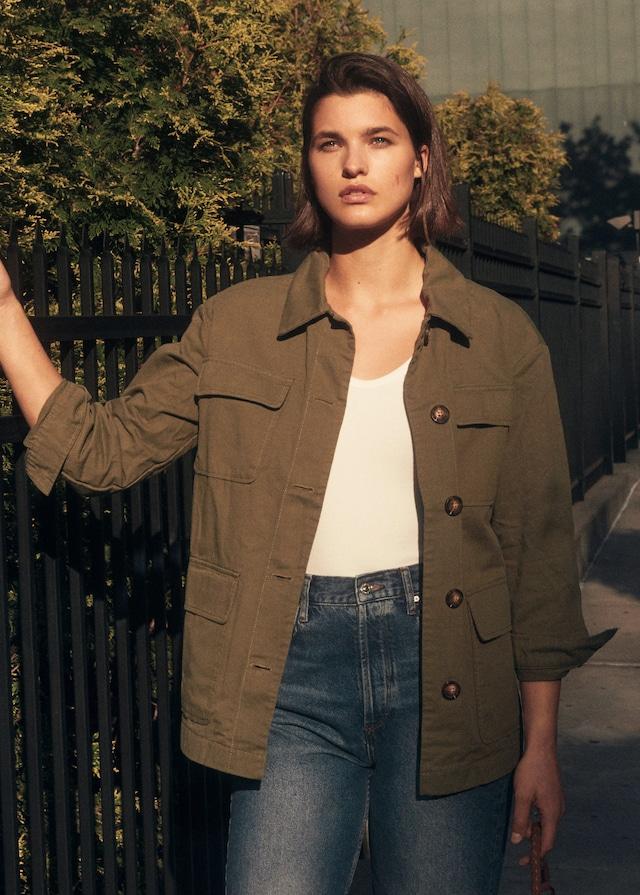 Medium design. Cotton fabric. Classic collar. Four buttoned flap pockets at front. Long sleeve. Buttoned cuffs. Button up.